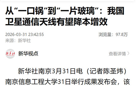 南京日报外表看上去像一块普通玻璃,表面规则分布着密密麻麻的线条,这款名为“玻璃基全息数字相控阵”的器件,是卫星通信的核心设备。前不久,由南京信息工程大学与南京中网卫星通信股份有限公司联合发布的这一成果正式亮相,标志着我国卫星通信地面终端核心器件迈入低成本、高性能、全场景适配、可规模化量产的全新阶段。“大锅”成过去式:一块“玻璃”让卫星通信更省钱更灵活全球卫星通信产业正在经历一场深刻变革。低轨卫星跑得快、在领土上空停留时间短,这对地面终端的跟踪能力提出了极高要求。“传统的卫星接收天线长得...