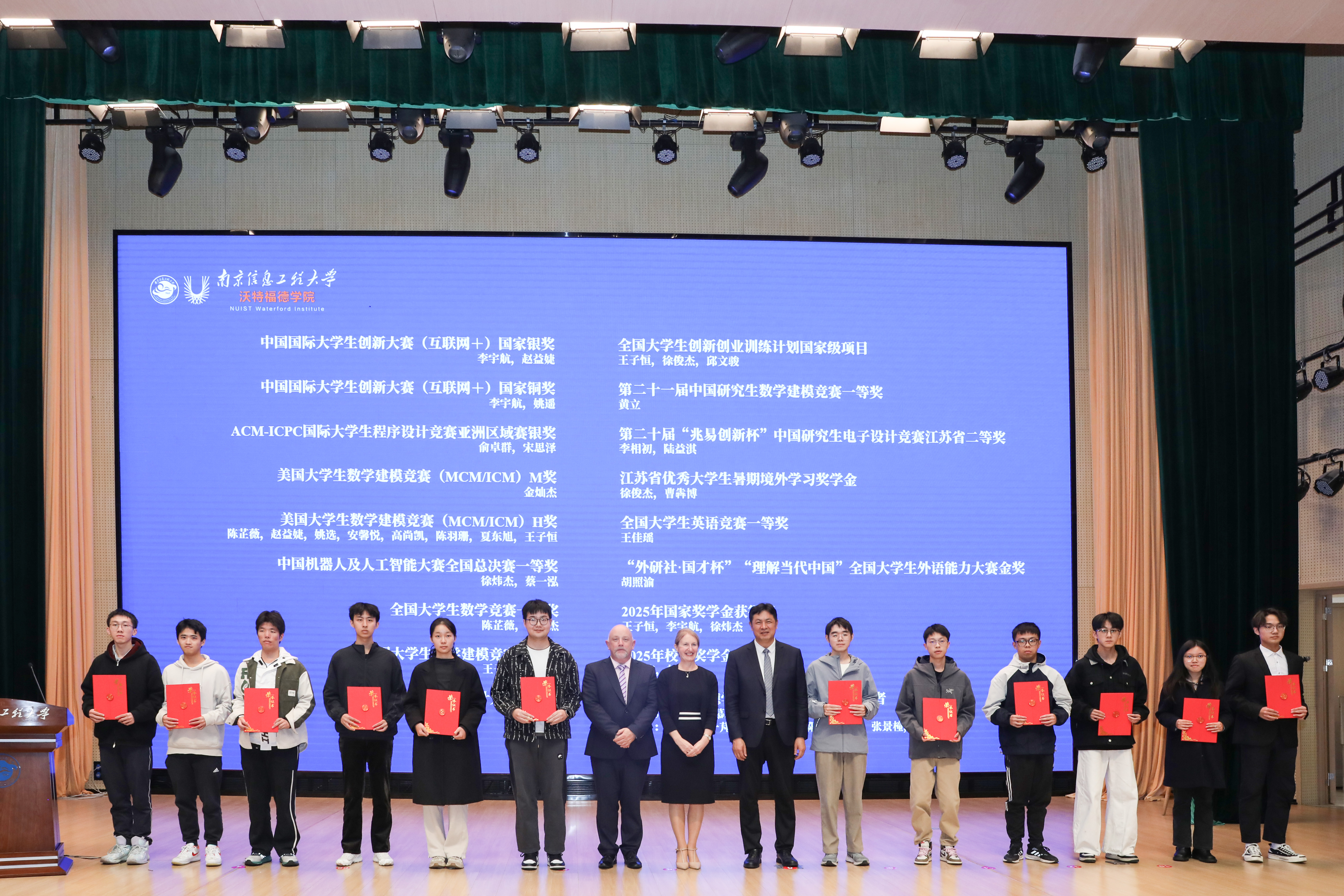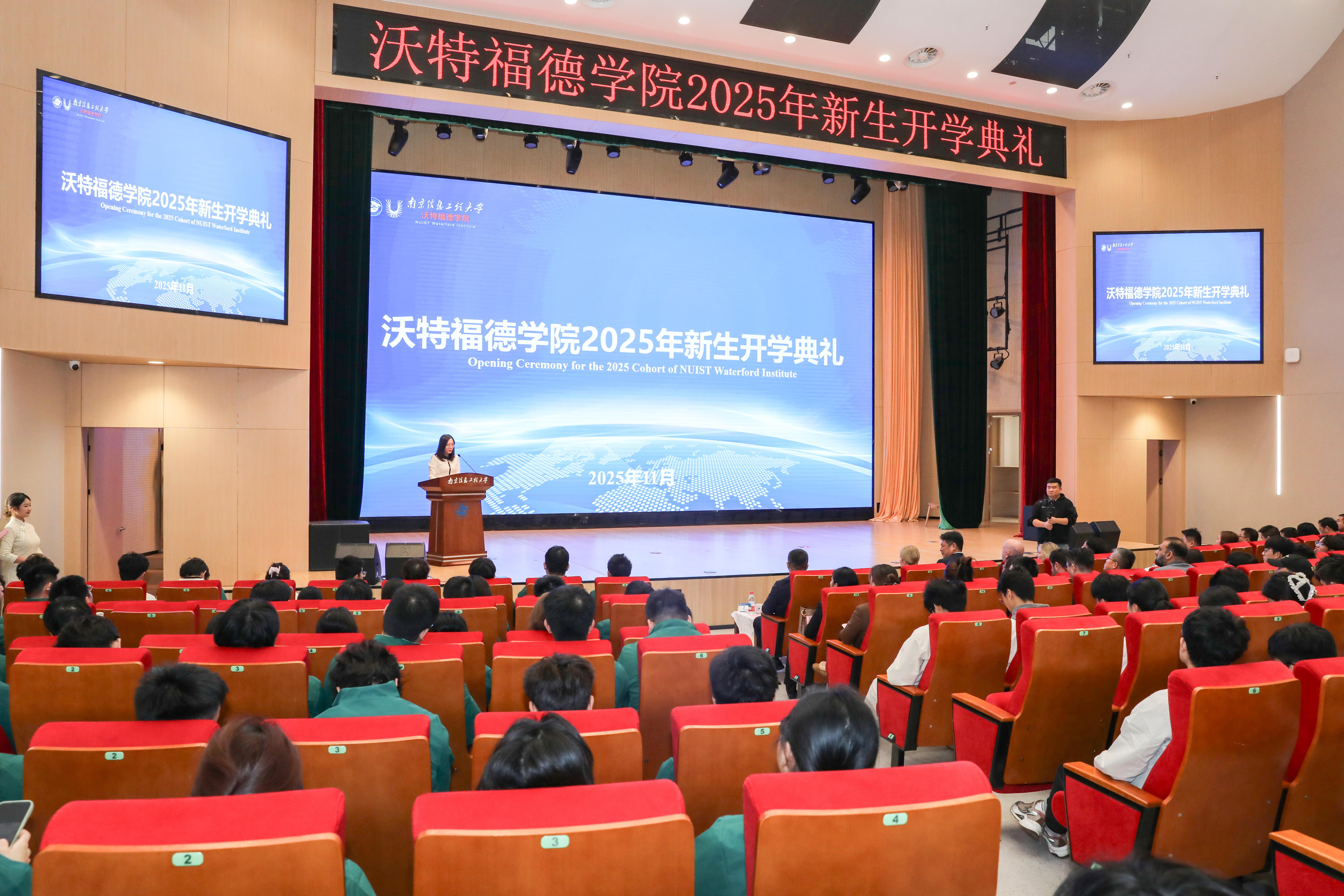 开学典礼上,我校校长陈海山在致辞中介绍了学校“双一流”建设成果及65年办学积淀,回顾了两校自2006年开启合作以来跨越式的发展历程。他强调,沃特福德学院是学校紧密对接国家战略与产业需求、融合欧洲先进工程教育理念举办的中外合作办学机构,发展态势良好。面对新生选择的充满机遇与挑战的国际化成长道路,陈海山对新生提出三点希望:一是立鸿鹄之志,心怀家国;二是求创新之真,勤学不辍;三是拓视野之界,胸怀寰宇,并寄语新生学有所成、行有所获,成就更好的自己,成为可托未来的栋梁。Veronica Campbell首先肯定了两校合作的丰硕成果。她说,国际教育是连接国界、培养全球公民意识、共建和平可持续社会的关键。这段学习经历将成为学生人生旅途的宝贵财富,不仅能助力开拓国际视野、结交良师益友、把握发展机遇,为未来事业筑牢根基,还能获得专业教师团队的指导,为学习发展提供有力支撑,期望同学们好好珍惜,获得成长与发展。开学典礼上,双方校领导为在各类竞赛中获得国家级奖项的代表颁奖,还相继进行了国际胜任力导师、班主任、副班主任聘任仪式。