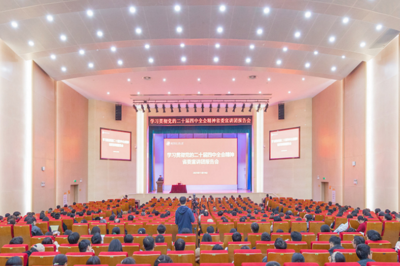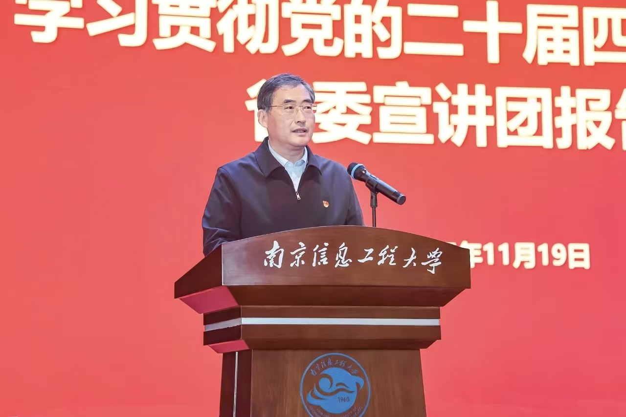 11月19日下午,学习贯彻党的二十届四中全会精神省委宣讲团报告会在我校风云剧场举行。省委宣讲团成员、中共江苏省委党校党史党建教研部主任张加华教授作专题宣讲报告。校党委书记尚洪波主持报告会。