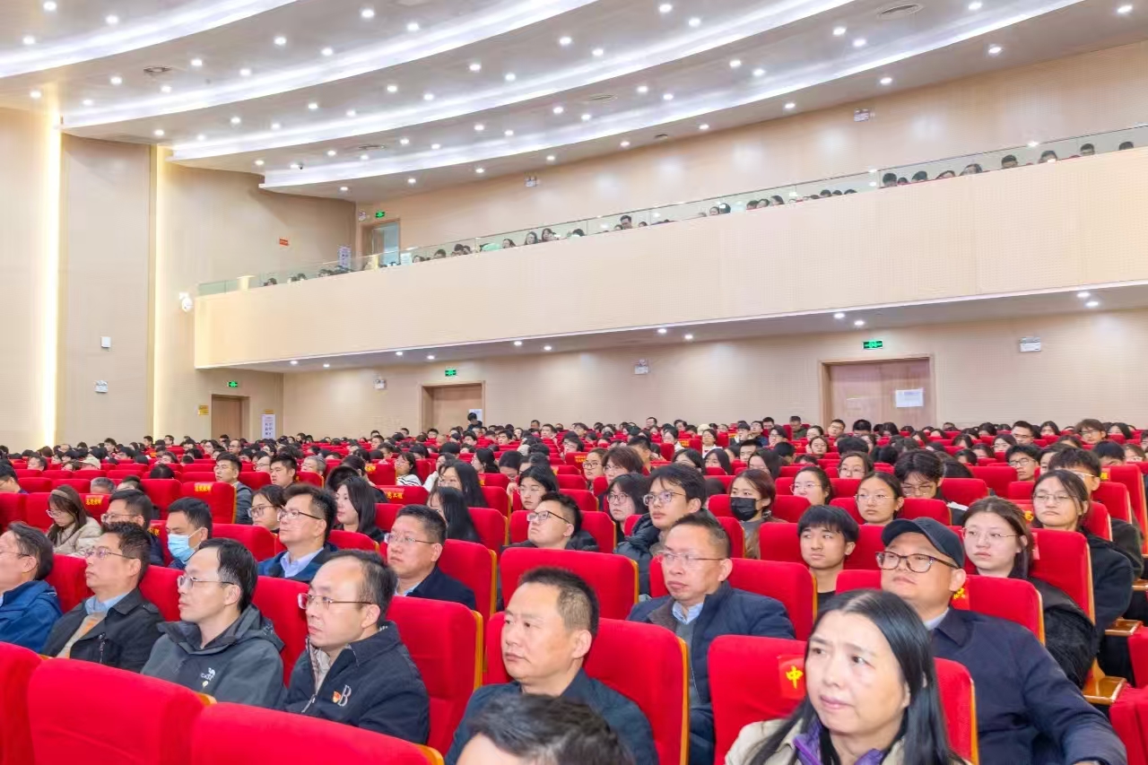 我校全体在校校领导、全体两委委员,全体科级以上干部,教师和学生党支部书记,马克思主义学院全体教师,各民主党派、无党派代表,离退休老同志代表,校“青马工程”学员代表,共近千人参加会议。