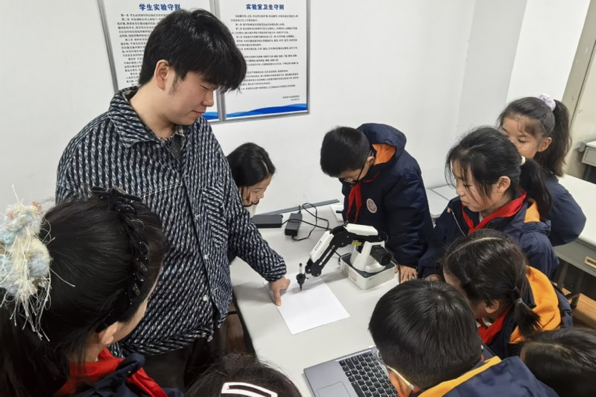 春假中,校园内秩序井然,温馨宜人。在粉色星雨般的樱花树下,有天真童趣的小朋友们在嬉戏、画画;在红艳似火的山茶树旁,有闲坐长椅的闺蜜们回忆美好时光;在清波荡漾的天鹅湖旁,有成群的中学生愉快地与天鹅宝宝互动。最热闹的还是各科普基地和实验室。