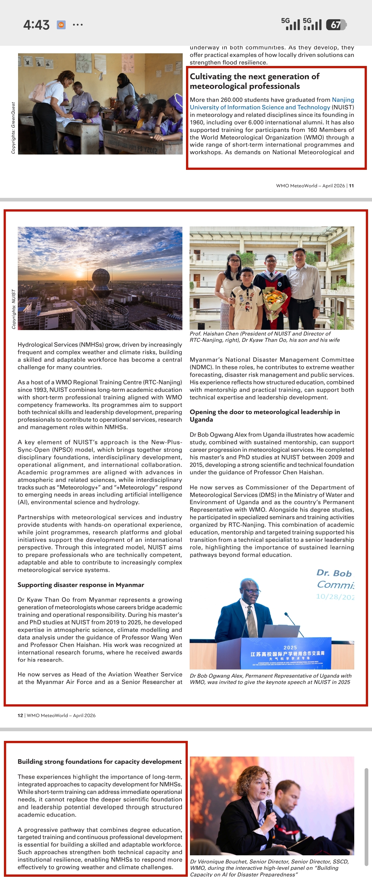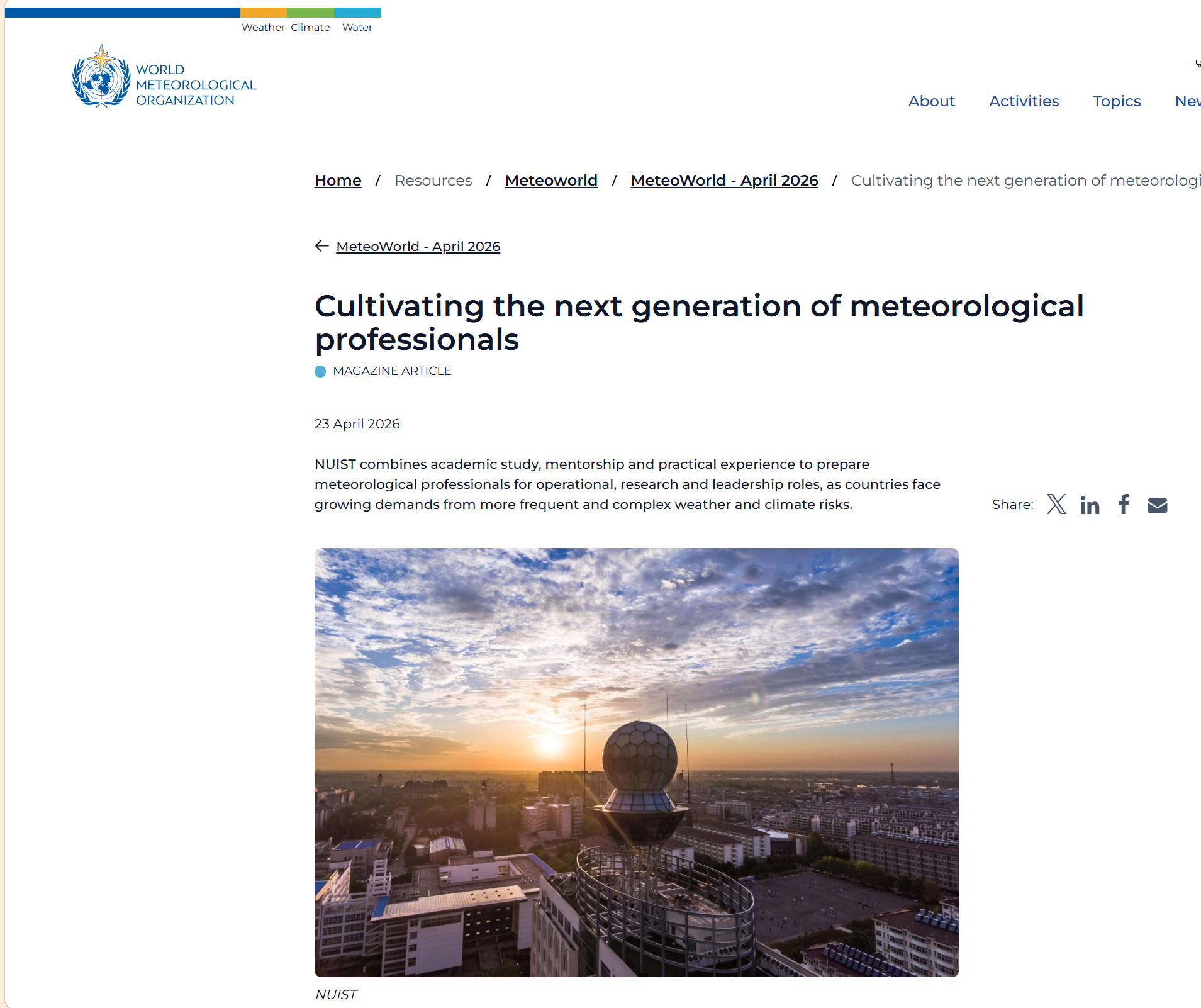 近日,世界气象组织(WMO)在其官方网站和刊物《气象世界》(MeteoWorld,2026年第一期),以专题形式聚焦报道了我校在国际气象人才培养领域的创新实践与突出贡献。报道以“培养新一代气象专业人才”为题,高度评价我校在全球气象能力建设,特别是助力发展中国家人才培养方面取得的显著成效。