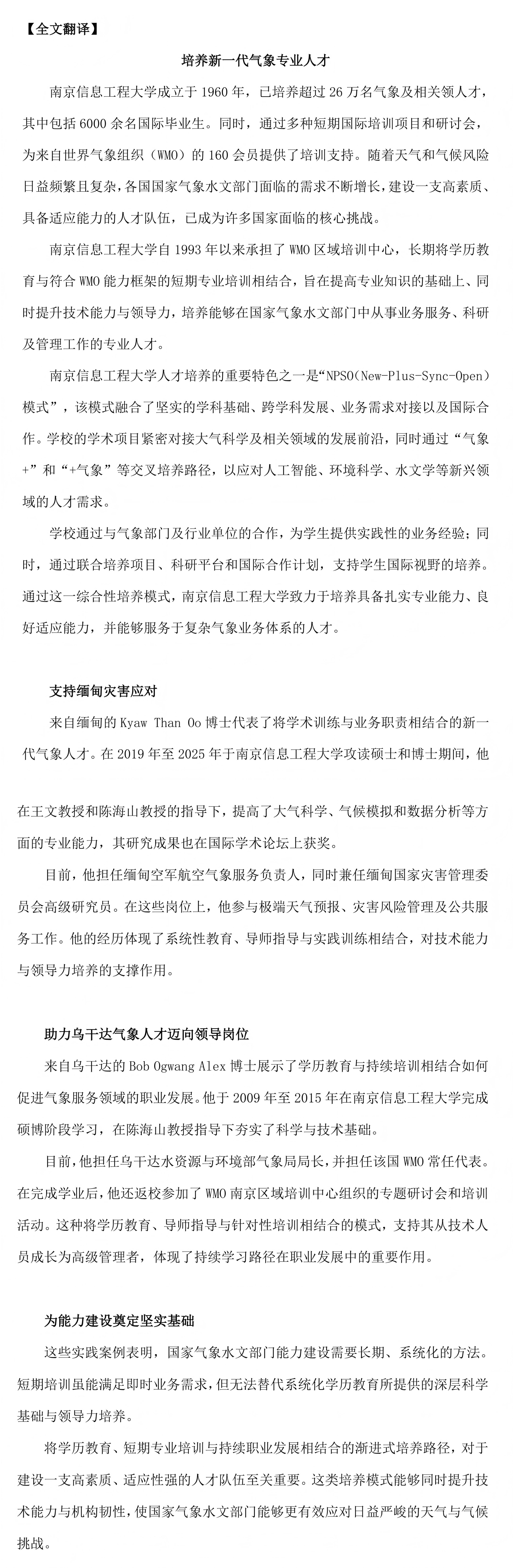 世界气象组织高度认可南信大独具特色的国际化人才培养模式。学校依托优势学科与国际合作网络,构建了“学历教育”与“专业培训”协同推进的培养体系,精准对接国际前沿业务需求,旨在锻造具备扎实科学素养、过硬实践能力和广阔国际视野的复合型气象英才。报道特别指出,学校在服务发展中国家能力建设方面成果丰硕,通过长期学历教育与短期专项培训相结合,为各国输送了大批骨干人才,其中多人已成长为所在国气象领域核心管理者,他们的发展路径,成为南信大国际气象人才培养质量的最佳注脚,充分体现了南信大一流学科的国际担当。