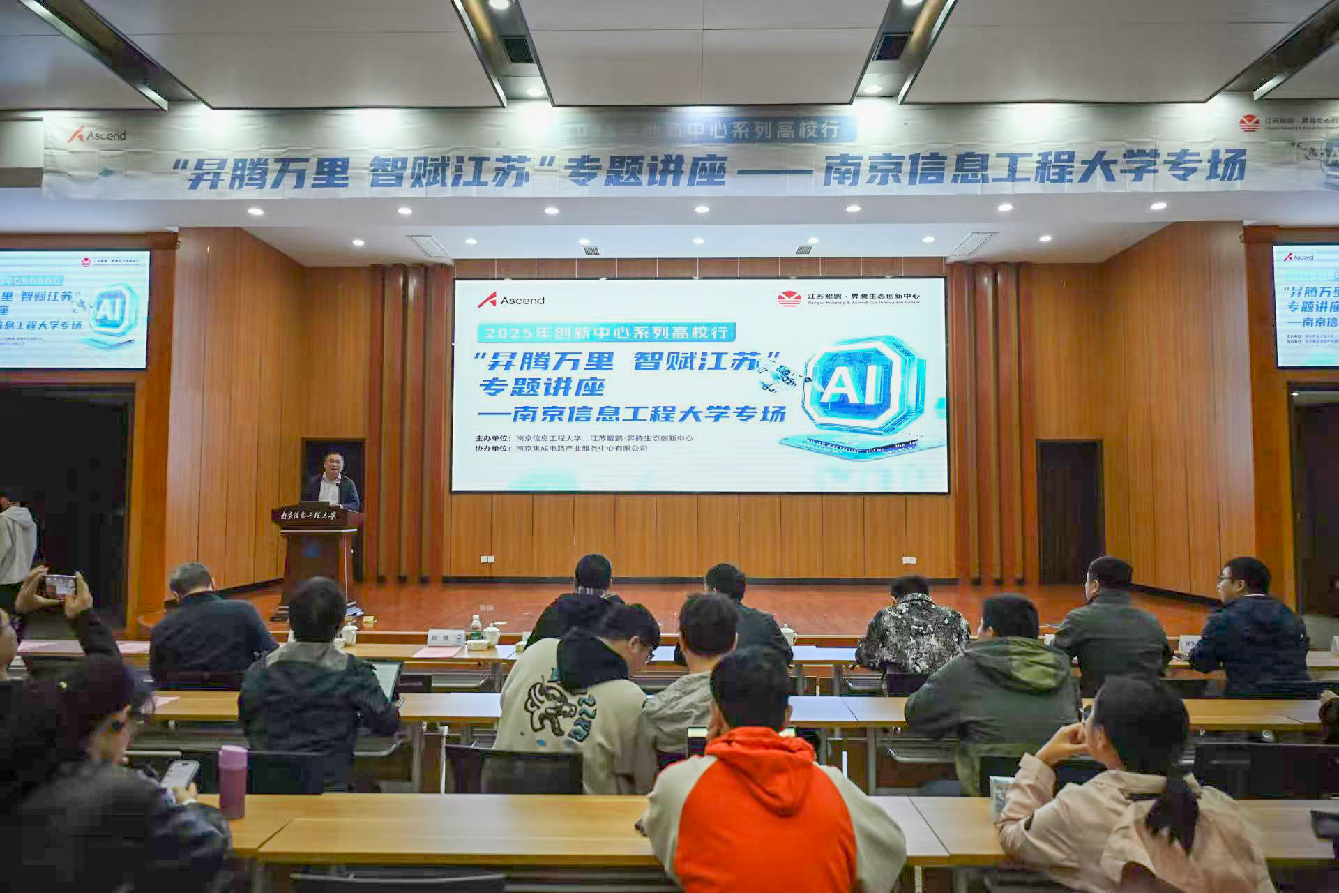 10月19日,2025年江苏鲲鹏·昇腾生态创新中心系列高校行——“昇腾万里,智赋江苏”专题讲座在滨江楼报告厅顺利举行。创新中心专家团与我校师生面对面,共话AI前沿、共商产教融合。我校副校长金自康,江苏鲲鹏·昇腾生态创新中心首席运营官陈祥禄出席活动。