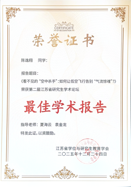 12月24日,由江苏省教育厅指导、江苏省学位与研究生教育学会主办的2025年第二届江苏省研究生学术论坛在南京举办。我校4名博士研究生参赛,获最佳学术报告奖1项,优秀报告奖3项。
