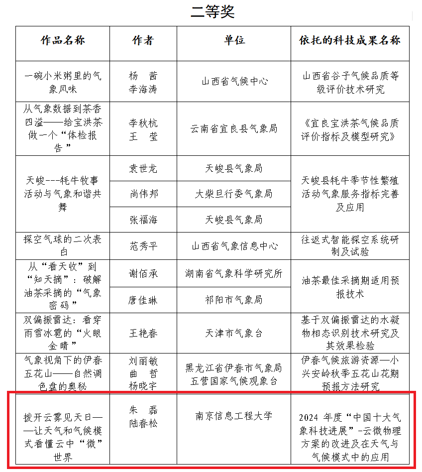 近日,中国气象学会关于气象科技成果转化气象科普文章评审结果正式揭晓。本次中国气象学气象科技成果转化气象科普文章征集活动共有100篇文章获奖,其中一等奖10篇,二等奖31篇,三等奖59篇。由南京信息工程大学朱磊博士、陆春松教授与中国气象局人工影响天气中心段婧研究员联合创作的科普文章《拨开云雾见天日——让天气和气候模式看懂云中“微”世界》荣获二等奖。
