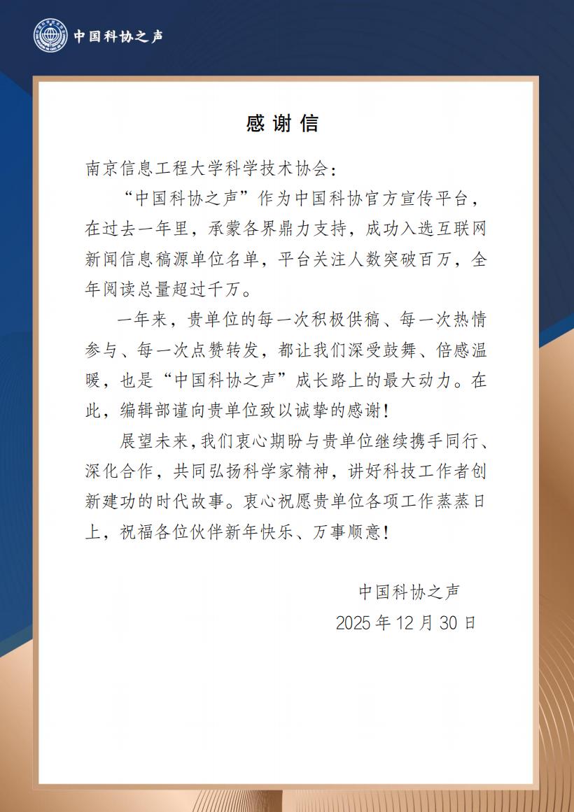 我校始终秉持“厚德、博学、求是、创新”的校训,依托自身学科优势,在推进科学研究、人才培养的同时,高度重视科学精神传播与科技文化普及工作。此次获得中国科协之声的肯定与感谢,进一步彰显了我校在科技传播领域的积极作为。未来,我校将继续依托科学技术协会等平台,与中国科协之声深化合作,持续做好科学家精神弘扬与科技故事传播工作,为营造良好科技文化氛围、助力国家科技事业发展贡献南信大力量。