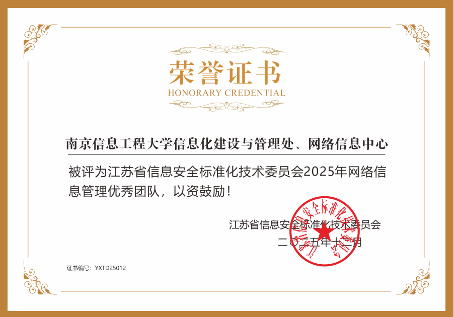 2025年,我校在信息化建设和校园网络工作方面成绩突出,获“中国教育和科研计算机网优秀会员单位”和“江苏省信息安全标准化技术委员会2025年网络信息管理优秀团队”荣誉称号。