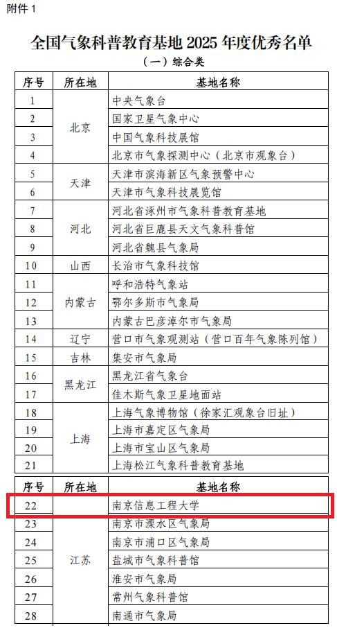 1月6日,中国气象学会正式公布2025年度全国气象科普教育基地工作总结情况。本次总结工作严格遵循《全国气象科普教育基地管理办法》要求,经各基地在线填报、各省气象学会审核、专家综合评审等多环节严谨遴选,全国共有134个科普基地获评优秀,其中江苏省7家单位榜上有名。我校全国气象科普教育基地凭借扎实的工作成效与创新的科普模式,成功跻身优秀行列。