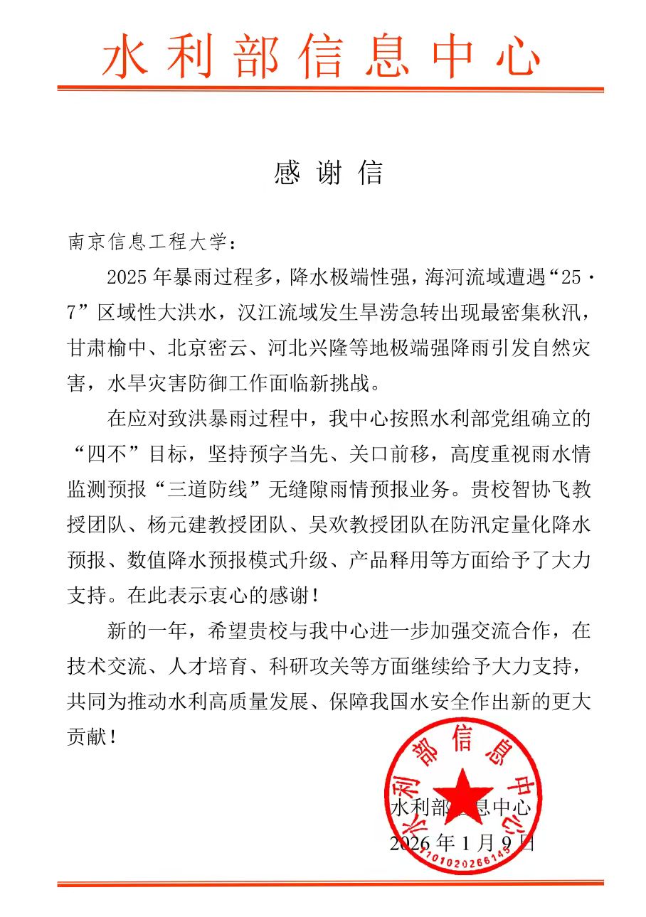 感谢信称,2025年汛期暴雨过程多,降水极端性强,海河流域遭遇“25.7”区域性大洪水,汉江流域发生旱涝急转出现最密集秋汛,甘肃榆中、北京密云、河北兴隆等地极端强降雨引发自然灾害,水旱灾害防御工作面临新挑战。南京信息工程大学专家团队积极配合支持水利部防汛工作要求,为水利部信息中心提供防汛定量化降水预报、降水数值预报模式后处理和产品释用等高质量、高水平专业支持,为防汛工作做出了重要贡献。