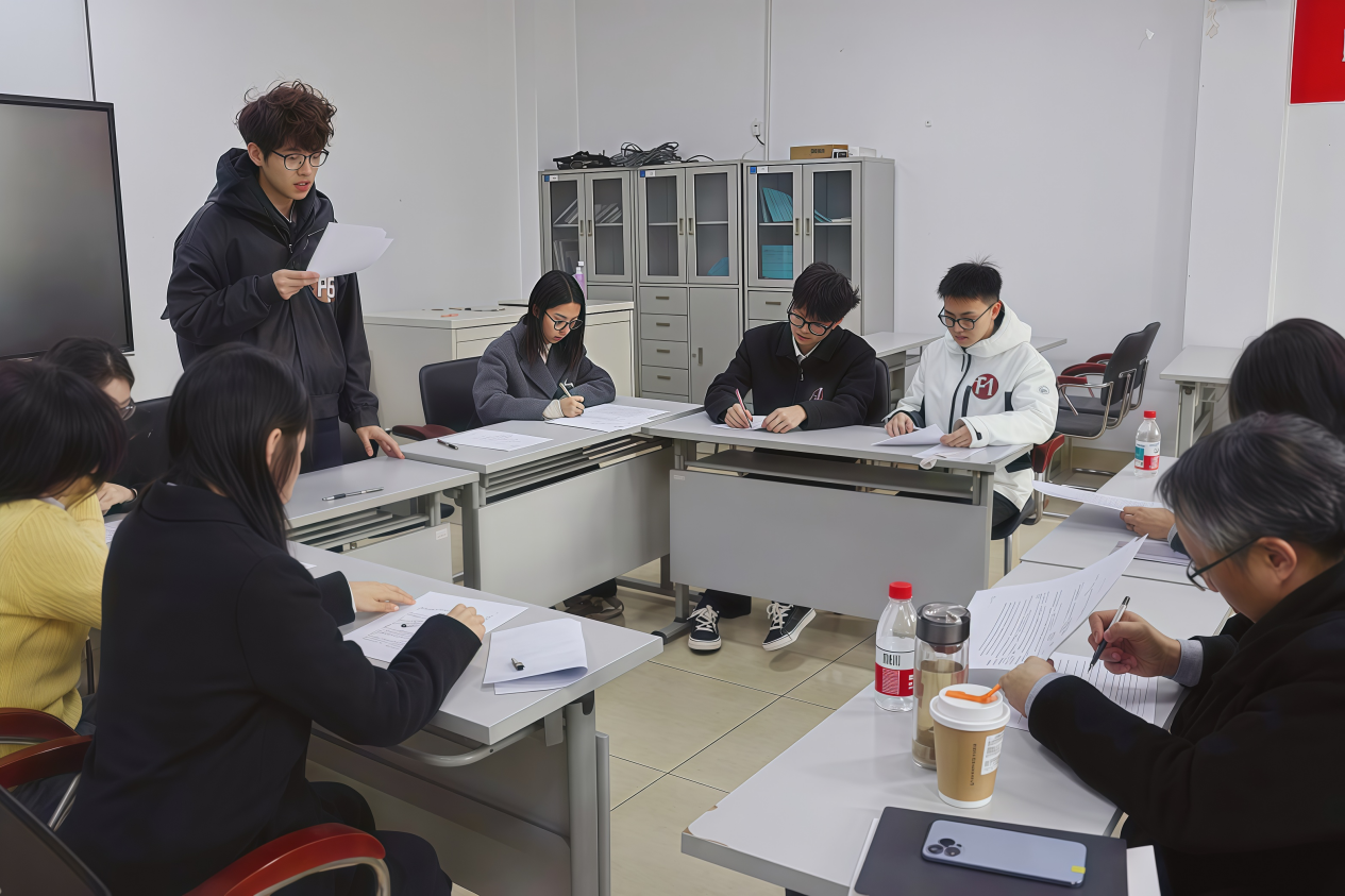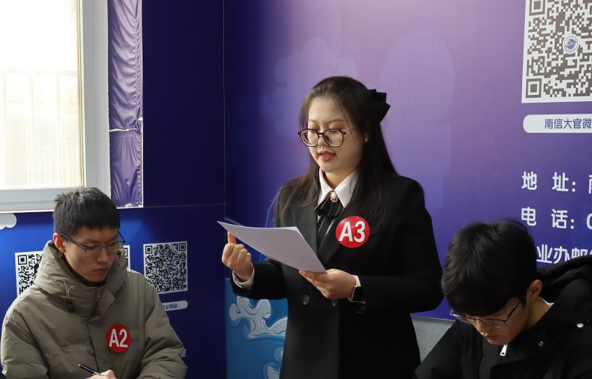 大赛在紧张而有序的氛围中拉开帷幕。决赛设置无领导小组讨论与结构化面试两轮考核环节,层层递进考察选手综合能力,精准对接职场实战需求。无领导小组讨论环节,选手们迅速分工、积极协作,围绕真实职场案例展开讨论,充分展现了逻辑思维、团队合作、语言表达与问题解决能力。结构化面试环节,选手们仪容整洁、沉着自信,回答问题条理清晰、引证充实,展现出南信大学子知识扎实、视野开阔、敢于挑战、潜力突出的精神风貌。