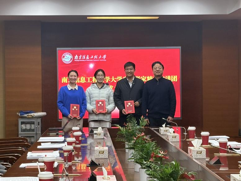 会议首先举行了南京信息工程大学大学生科学家精神宣讲团成立仪式。章炎麟表示,我校响应中国科协要求,依托原创大戏《风雨长望》成立大学生科学家精神宣讲团,构建“一部大师剧,一个宣讲团,一批演说活动”常态化格局,助力学生成长成才,营造良好科技创新生态。学校将推动宣讲团建设,把舞台剧成果转化为育人资源,将科学家精神融入科研育人全过程。章炎麟为宣讲团团长王玥及指导老师史恒、李蓓蓓颁发聘书并合影。