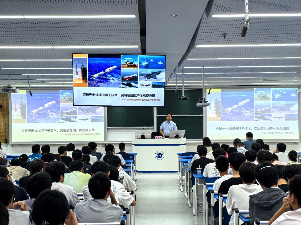 李亚明以“突破光电线缆卡脖子技术,实现装备国产化规模应用”为题作报告,他以“军工情怀”为切入点,深情回顾了自己从一名普通本科毕业生成长为行业首席专家的奋斗历程。他结合南京全信传输科技股份有限公司的发展史,分享了在光电传输网络系统、光电线缆及光电连接器等领域的技术创新实践,特别是牵头完成的多项国防领域科研项目的宝贵经验。李亚明表示,实践是能力培养的基石,唯有将理论知识与实际应用紧密结合,才能在专业领域取得突破。