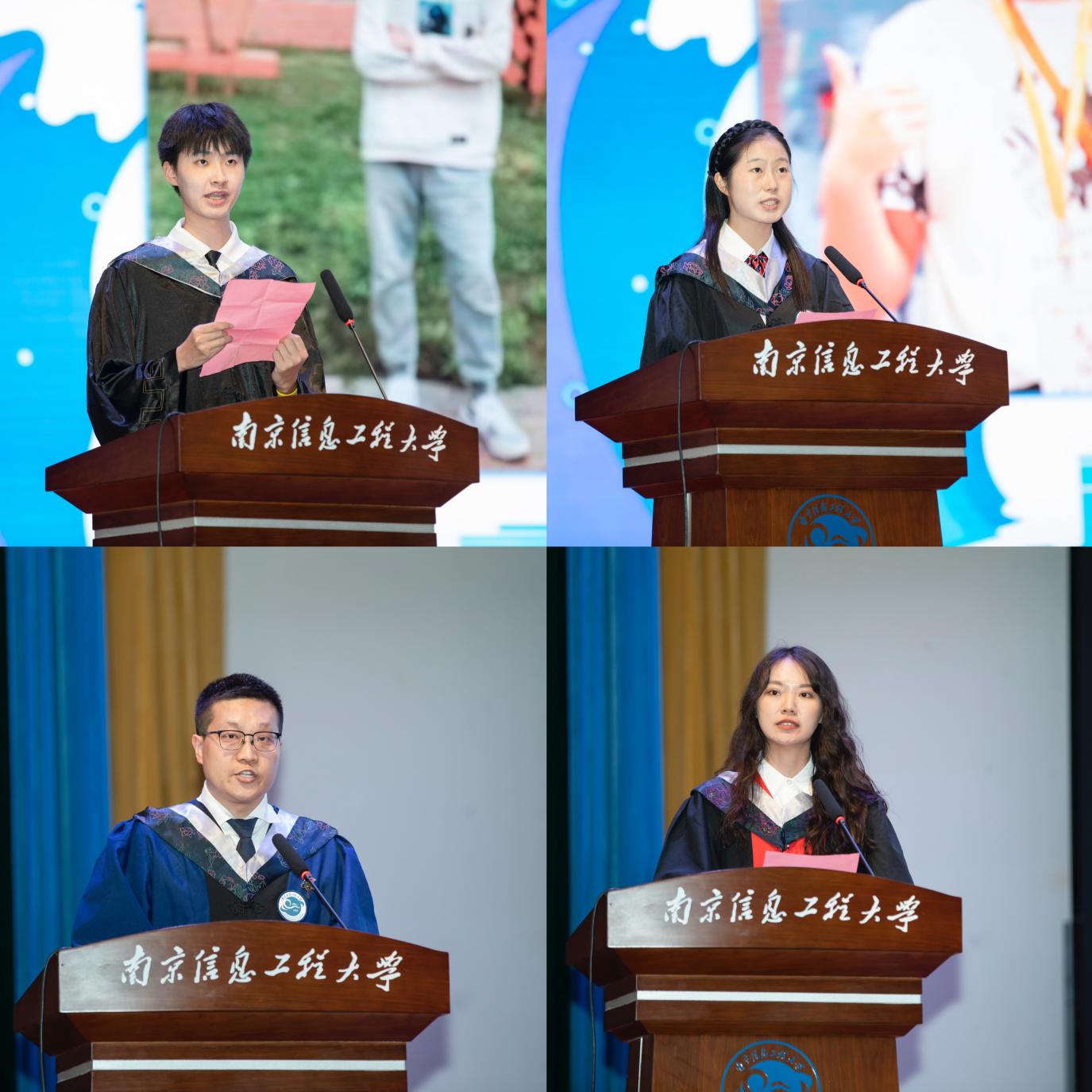 紧接着,本科毕业生代表王志国、拔尖班毕业生代表於致宁、硕士毕业生代表周昕及博士毕业生代表张诗悦依次发言。他们深情回顾在大气院求学的难忘时光,从挑灯夜战的课堂学习、攻坚克难的科研探索,到无私奉献的志愿服务、欢乐融洽的同窗情谊,言语间满是对校园生活的眷恋不舍,对师长同窗的诚挚感恩,以及对未来人生的热切期待。