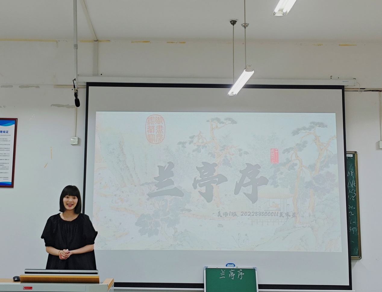 比赛现场,参赛选手们各展所长,围绕中学美术教材内容,进行6 分钟课堂教学片段模拟授课。同学们将中学教材中的经典内容进行个人理解与设计。有的学生以《兰亭序》为题,借助精美的PPT展示曲水流觞的意境,让“课堂” 充满互动性;还有学生选取《簪花仕女图》,带领“学生”们穿梭古今。参赛选手们巧妙运用视频、动画等多媒体资源资源,在6分钟内,完成从导入、互动、知识讲解到课后思考的过程,展现出扎实的专业素养与教学能力。