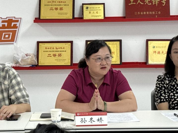 校“十佳班主任”孙冬娇分享从教经验。她从四个方面解读了班主任在育人过程中承担的四个角色:一是做思想引领者,注重培养学生责任担当;二是做知心领路者,精准指导学生学习、考研、就业;三是做爱心守护者,全心助力学生健康成长;四是做技能传播者,全力指导学生实践成才。