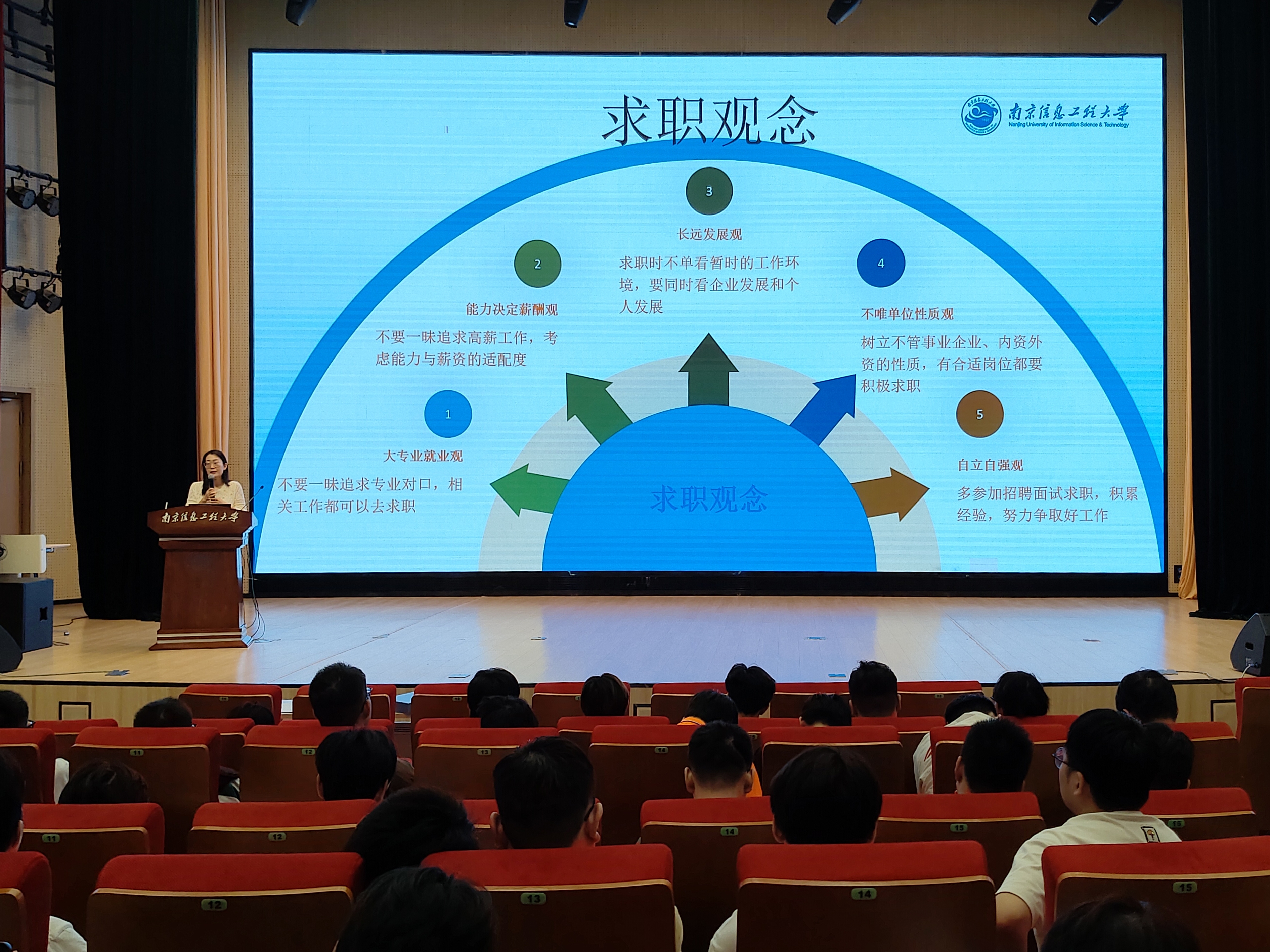 金红对照《学生手册》逐一解读毕业审核清单,提醒同学们尽快查漏补缺。在“勇往‘职’前——就业推进”板块,金红为毕业生梳理了完整的就业时间线与行动指南,包括就业信息获取渠道、简历投递、面试技巧、就业协议书与劳动合同的区别、网签流程以及“大专业就业观”和“长远发展观”等求职观念。针对前期收集到的求职简历中的常见问题,金红结合课程设置和项目经验,图文并茂地提出了简历优化的建议。吴礼福向与会同学分享了考研上岸的三大秘诀:有效的信息搜索、科学的备考和坚持不懈的精神,鼓励考研学子“百尺竿头,更进一步”,争取一战成“硕”。