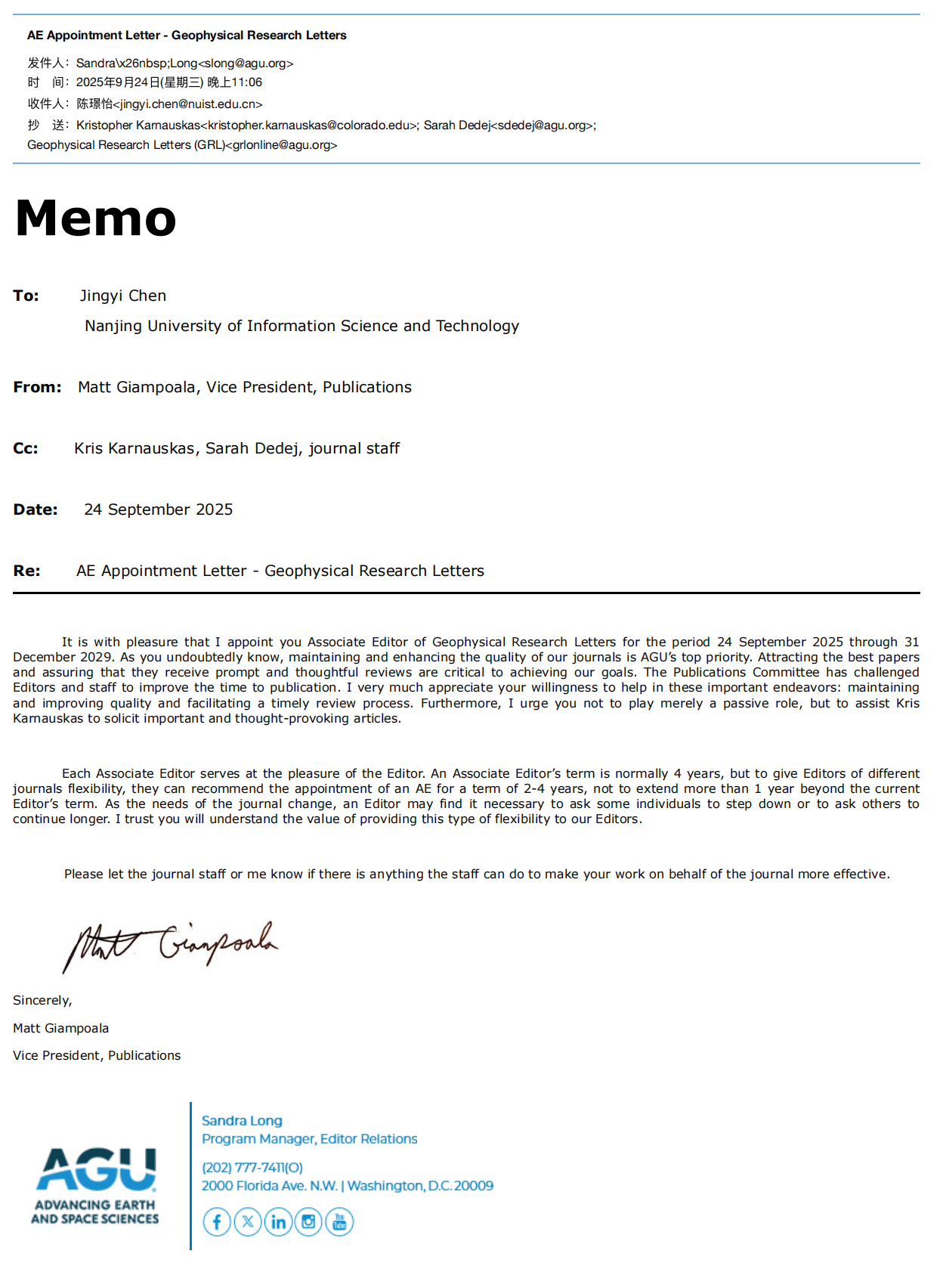 近日,国际知名学术期刊《Geophysical Research Letters》(GRL)发函邀请大气物理学院陈璟怡教授担任其编委会副编辑(Associate Editor),任期自2025年9月24日开始。