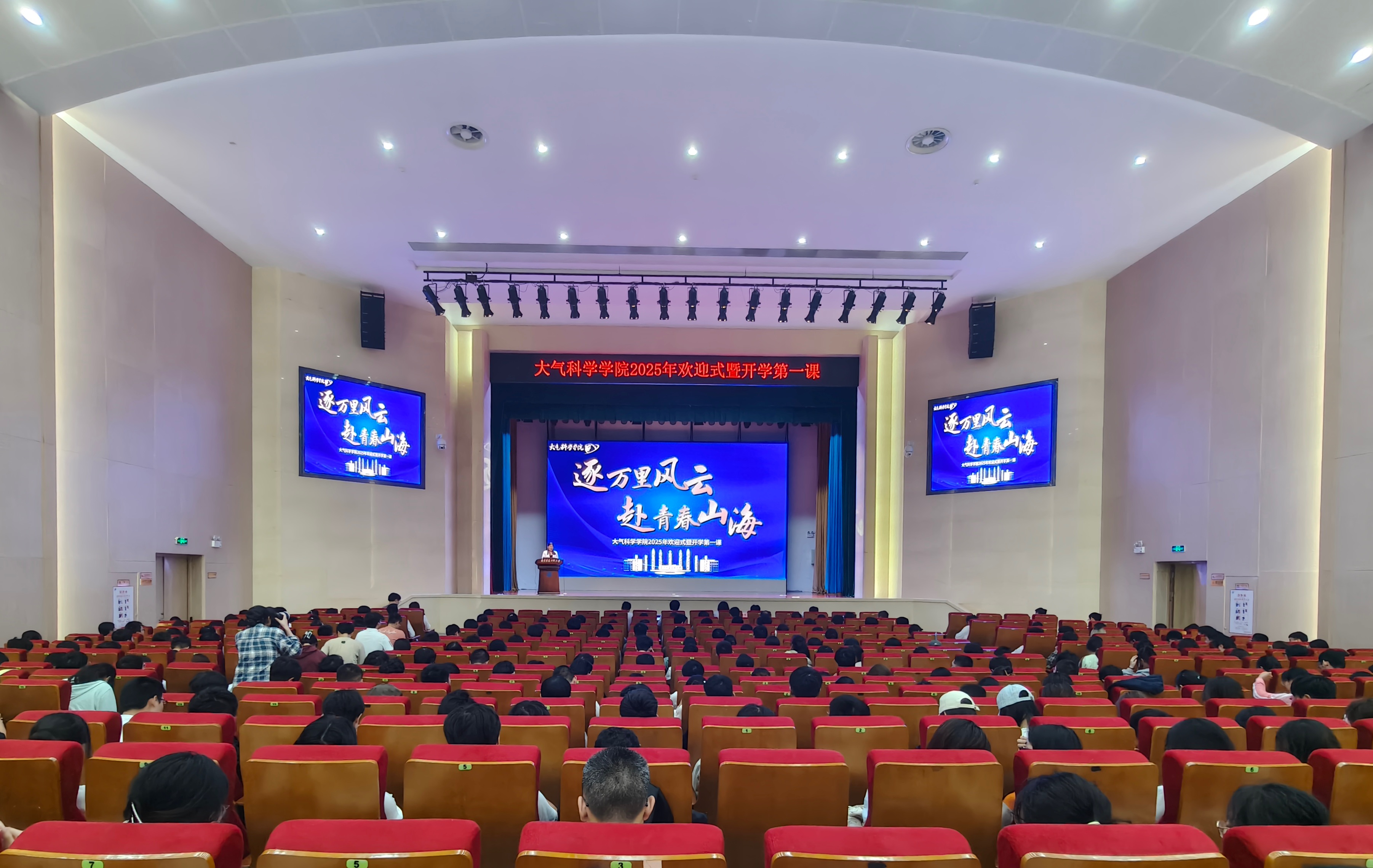 为加深本硕博新生及大类分流学生对学院的了解,助力其快速适应新环境、融入学院集体,打造积极向上、奋勇争先的良好风气,9月24日下午,大气院在风云剧场举行“逐万里风云,赴青春山海”2025年欢迎式暨开学第一课。院长周波涛、院党委书记周淑琴、副院长张文君、副院长李青青、副院长尹志聪、院长助理、各系主任、导师代表、2023级、2024级及2025级班主任、全体辅导员出席,2025级本硕博新生及2023级、2024级大类分流本科生分两场参与此次活动,活动由学院党委副书记、副院长李艳艳主持。