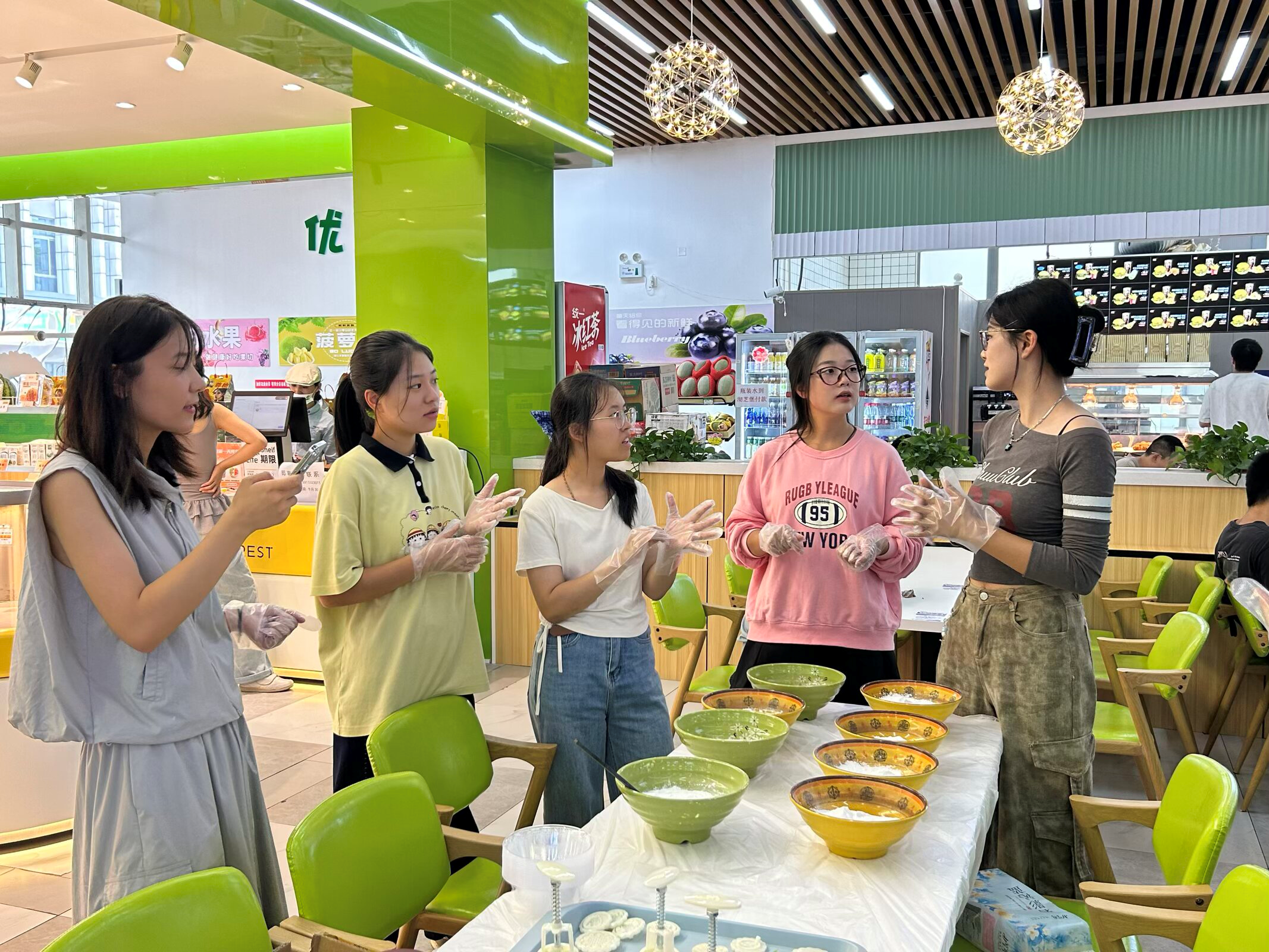 活动开始前,工作人员精心准备了馅料、模具等制作材料。现场设置了引导宣发组和现场教学组,为参与者提供指引和帮助。活动开始后,教学组同学通过步骤拆解和实物演示,详细讲解了从饼皮揉搓、馅料添加到模具按压的全过程,并对同学们提出的问题进行了现场解答。