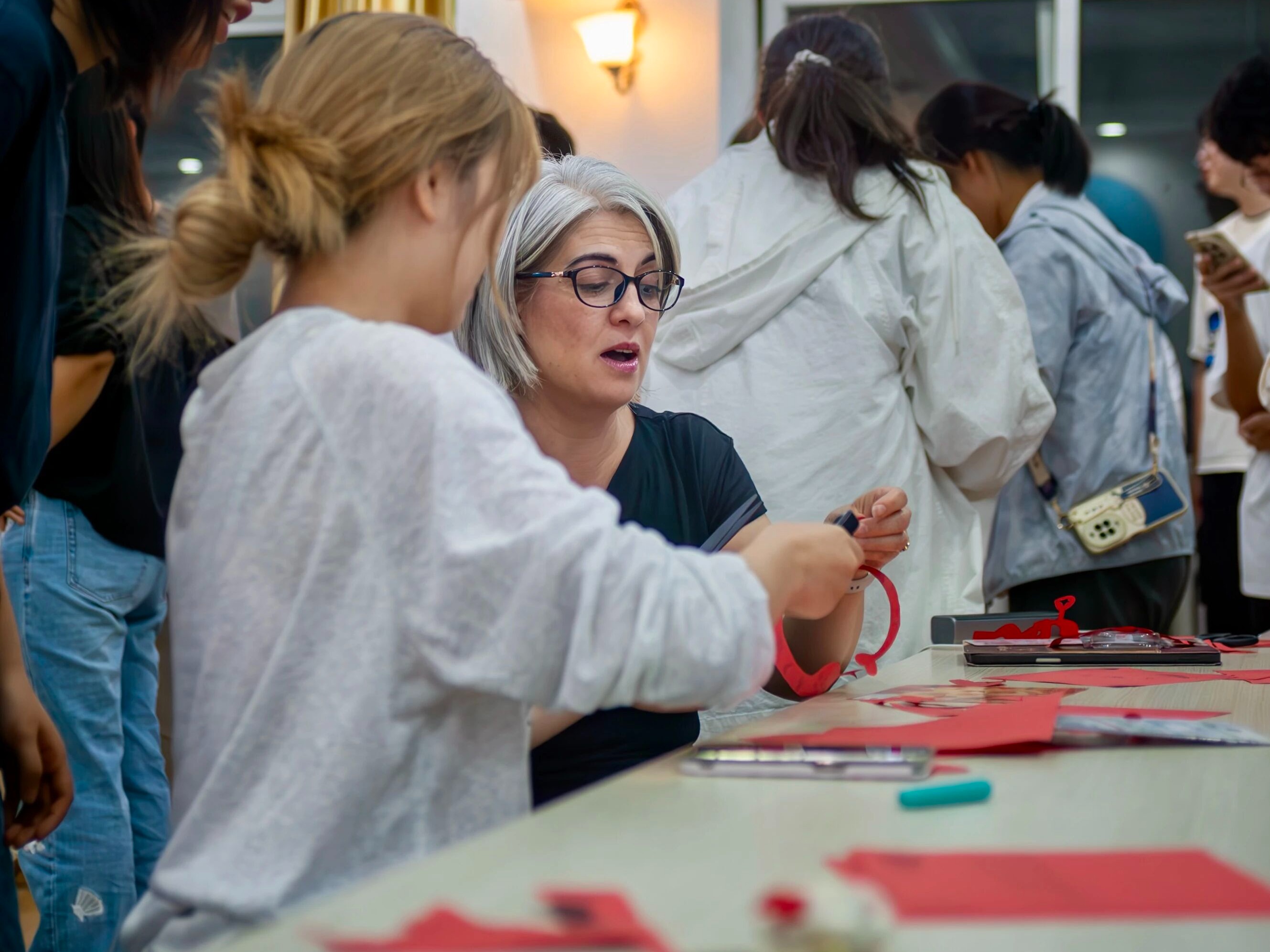 剪纸活动中,由同学现场剪出生肖等中国传统图案,师生共同根据半成品猜测完整图案。Daniela教授对中国剪纸表现出了强烈的兴趣,与同学们一同实践,在剪刀与纸张的交错中体会中华传统文化的审美情趣,增强对非物质文化遗产的认知和认同。