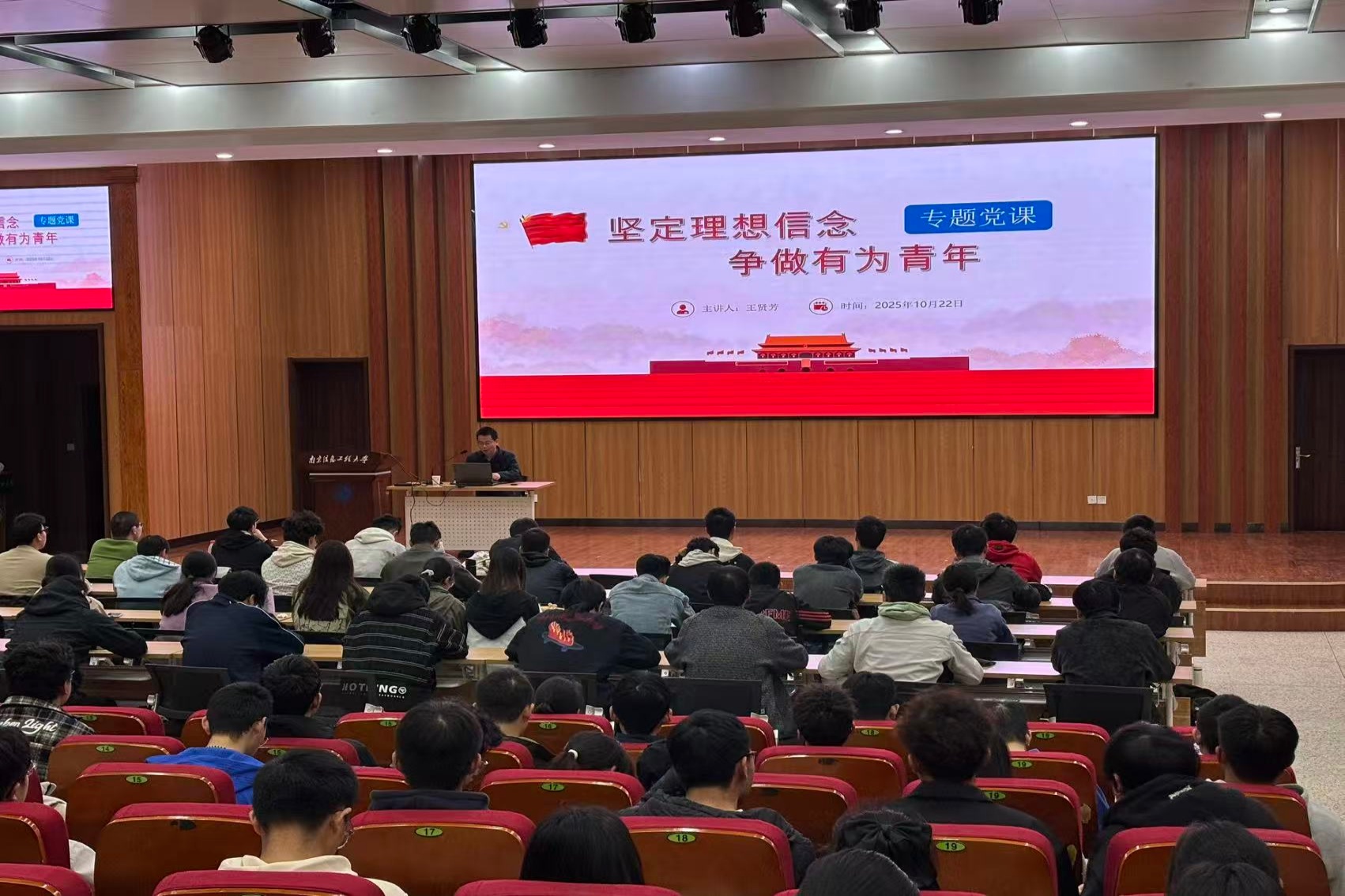 10月22日,自动化学院青马工程培训班第五讲在滨江楼报告厅举行。本次培训由自动化学院党委书记王贤芳主讲,2025年青马培训班学员、入党积极分子、入团积极分子参与到此次培训班的学习中。王贤芳以“坚定理想信念,争做有为青年”为主题,带领同学们重温英雄事迹,解读红色精神内核,明确当代青年责任。