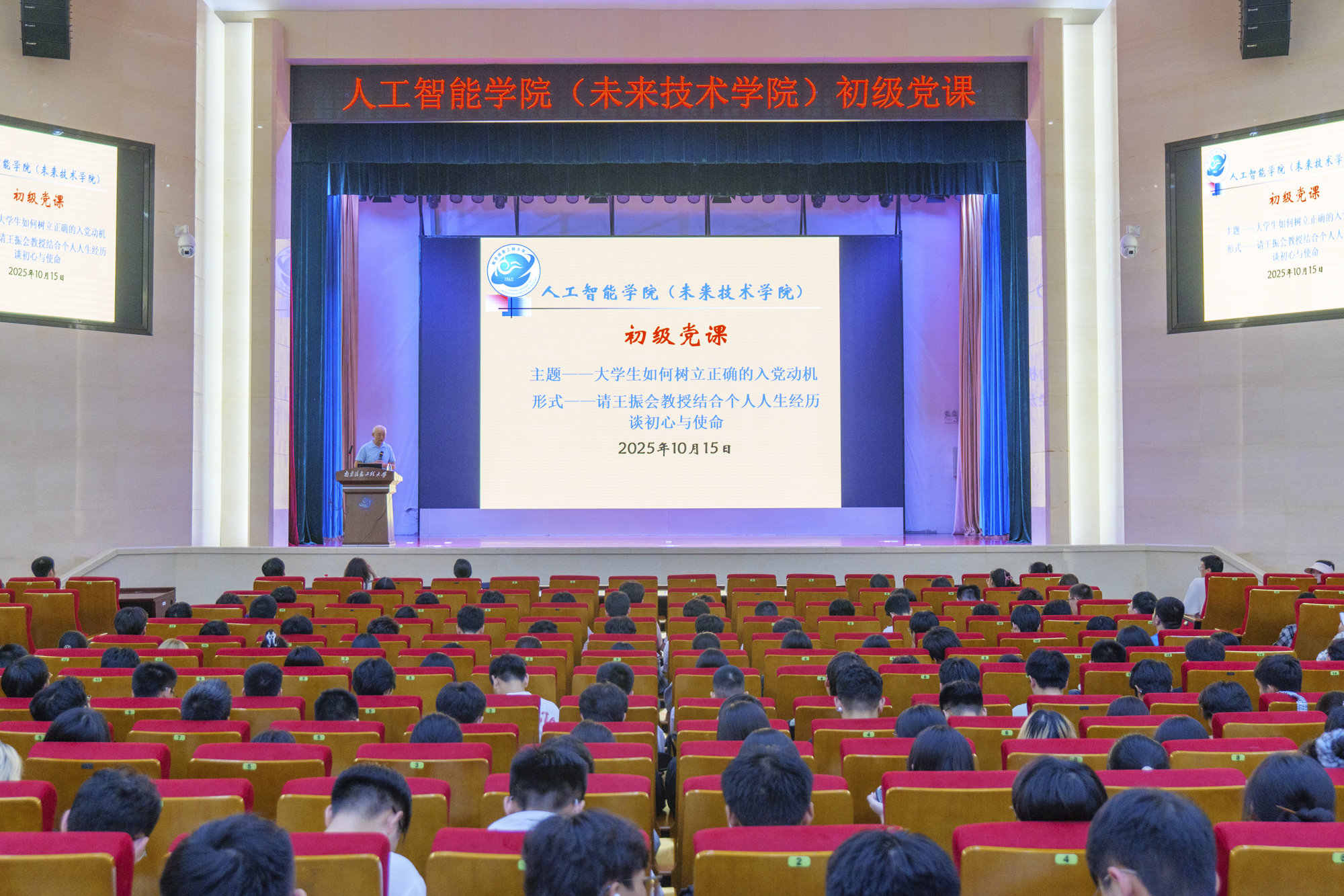 为进一步提升学生政治素养与思想觉悟,促进学生全面发展,10月15日晚,人工智能学院(未来技术学院)邀请王振会教授在风云剧场开展“谈初心,见行动”初级党课,学院2025级全体新生参与本次党课,共同完成了一场兼具理论深度与实践温度的思想洗礼。
