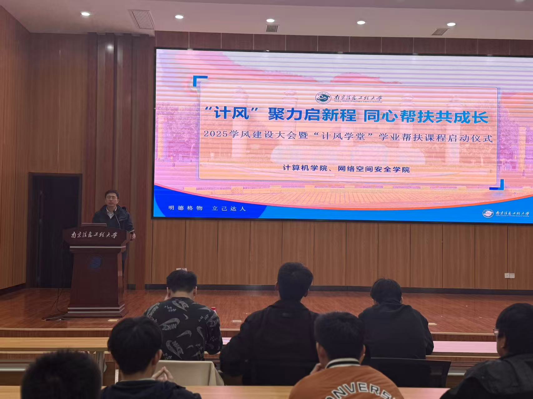 为传承学校“艰苦朴素、勤奋好学”的优良传统,激发学生内在学习动力,营造勤学、善学、乐学的浓厚氛围。10月30日中午,计算机学院、网络空间安全学院于滨江楼二楼报告厅召开“‘计风’聚力启新程 同心共扶促成长”学风建设大会暨学业帮扶启动仪式。学院党委副书记、副院长朱文镇,分团委书记陆燕,辅导员杨敏敏、刘杰,各班级学习委员、22至24级学业预警全体学生,以及“计风学堂”帮扶导师、助教参会。会议由谢欣怡主持。