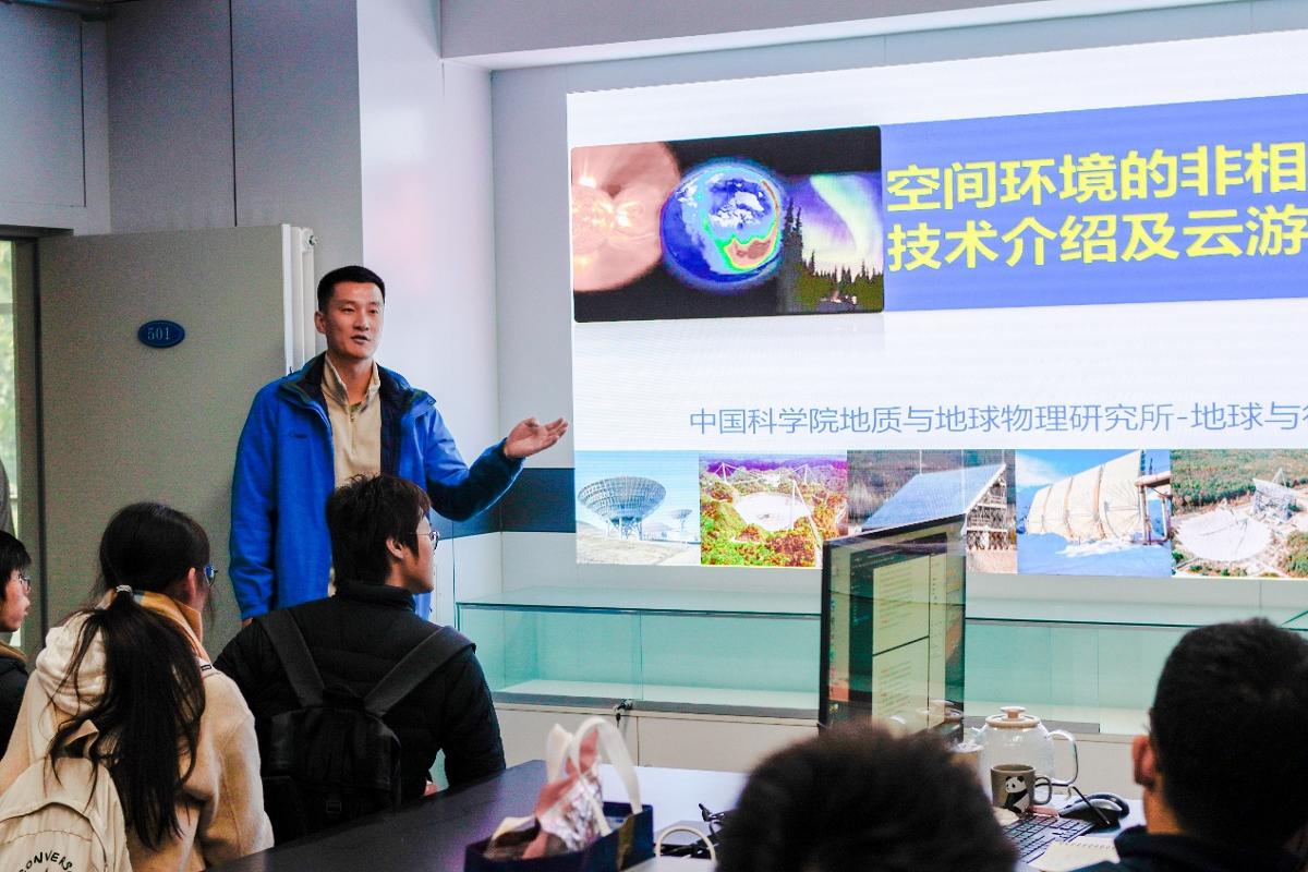 25日上午,地质与地球物理研究所业务主管于九龙首先对大气院师生一行的到来表示欢迎,随后为大家作了《地质地球所情况简介》报告。他系统介绍了研究所自1913年以来的悠久历史、走出49位院士的“鸿鹄楼”所代表的辉煌成就,以及研究所在深地探测、深空探测等前沿领域的重大科研突破。乐新安研究员在《近地空间趣事漫谈》报告中,通过电离层“等离子体泡”、汤加火山爆发引发空间波动、气候变化对高层大气的冷却效应等几个“小故事”,生动展示了近地空间的复杂现象,并重点介绍了三亚非相干散射雷达的强大观测能力。何飞研究员的《太阳系极光》报告,深入浅出地讲解了地球极光的激发机制与观测手段,并对比了火星(质子极光)与木星(卫星驱动)等行星的奇特极光现象。随后,南京信息工程大学的3位本科生也展示了他们的科研成果。陈良真同学报告了《江淮地区夏季旱涝急转特征及其关键环流的研究》,徐子瑜同学分享了《基于κ-Köhler理论估算雾中过饱和度的方法优化与分析研究》,董祥如同学则以《双偏振多普勒雷达“问诊”雷打雪》为题进行了科普报告。三位同学的报告展现了扎实的研究基础和活跃的学术思维,获得了在场老师的高度评价。