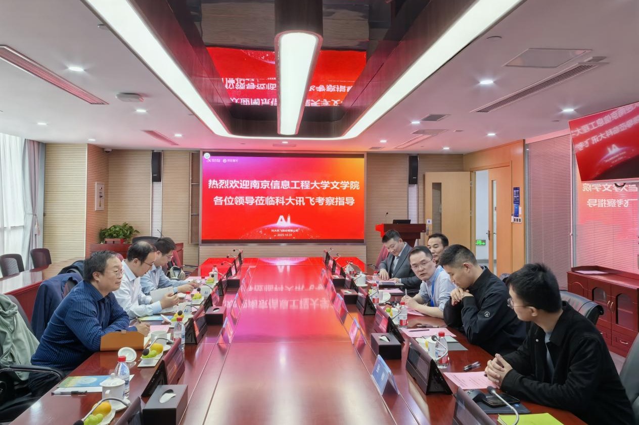 为主动对接前沿科技、推动学科交叉融合,10月31日,南京信息工程大学文学院与科大讯飞股份有限公司进行了以“共探人工智能赋能高等教育新路径”为主题的调研交流。学院党委书记郭雨、党委副书记高盛蔷、副院长郑友奇、英语系翻译系主任陈梅松,与科大讯飞产教融合业务华东区总监彭飞、高教生态合作总监董凌云、江苏大区高教大客户经理张永坤、高教事业群江苏市场经理李卫东、高教事业群江苏咨询经理张帅等共同参加。