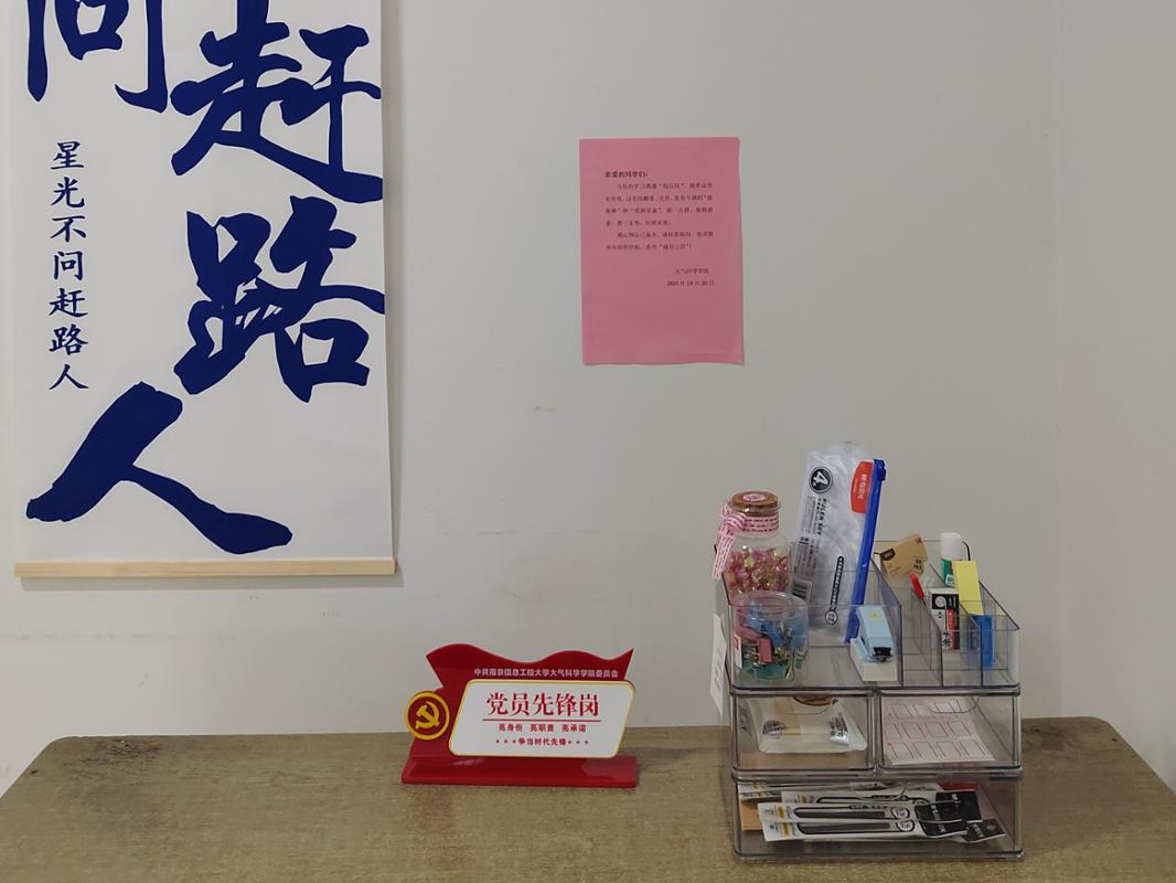 改造后的教室焕然一新。门口悬挂定制门牌,墙面以蓝绿色为主调,呼应大气学科特色,并手绘“星光不负赶路人”“奔赴山海”等励志标语。窗台点缀绿植与励志手账,营造舒缓视觉氛围。教室还专门设置了党员服务站,设有“爱心加油角”,备有糖果、常用药品、学习工具等物资;一旁的“心理暖阳角”处,志愿者们将写满祝福的纸条折叠成小星星,置于罐中,考研学子可随时取阅,在压力时刻收获一份暖意与力量。党员服务站不仅满足考研学子日常需求,也让教室成为同学们学习与心灵休憩的“第二家园”。