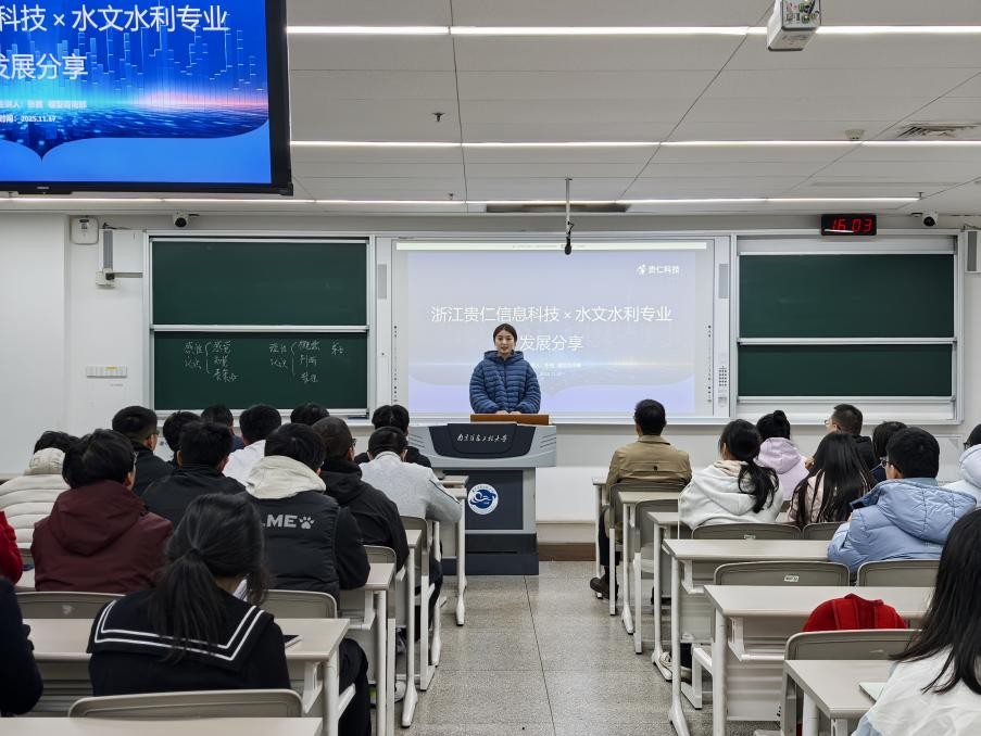 为帮助学生进一步明晰水文水利行业发展和就业前景,引导掌握适应行业发展核心技能,11 月 17 日,学院特邀浙江贵仁信息科技股份有限公司模型咨询副总监张茜来校,作水文水利专业发展与职业规划专题讲座。学院党委副书记、副院长戴庆龙,24、25级相关专业学生参加。讲座由辅导员陶维坤主持。