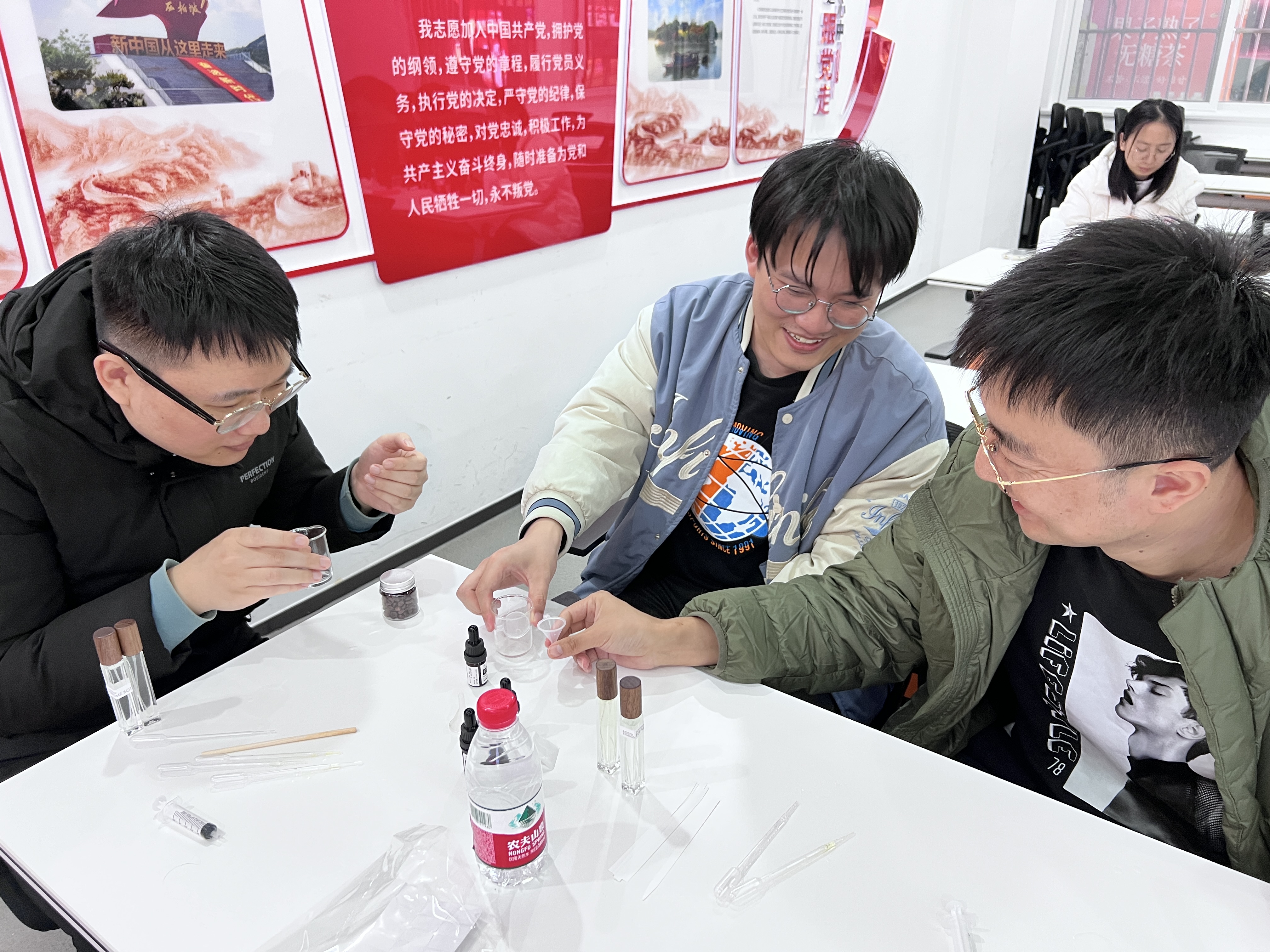 最具特色的香水DIY环节,成为硕博“传帮带”生动载体。博士党员们分享香水调配技巧与香氛搭配逻辑,指导硕士党员将抽象的“党员关键词”转化为可感知的嗅觉语言:用薄荷和青柠的清新生机诠释“初心”的纯粹,用雪松的沉稳厚重彰显“担当”的力量,借柏木的内敛温润体现“务实”的踏实。创作过程中,博硕党员两两结对,一边细致调配精油比例,一边交流气象科研中的心得与困惑。硕士党员认真记录博士学长在观测站实习的一线经历、优化数值预报的实用方法,并在瓶身郑重标注自己的姓名与对应关键词,让这一瓶瓶亲手调制的香水,不再是普通的香氛,更成为承载气象人初心的“精神名片”。硕士研究生第三党支部书记安蕊感慨道:“这瓶香水不仅承载着气象人的初心,是博士学长倾囊相授的经验馈赠,更是时刻提醒我们坚守使命的精神印记。”