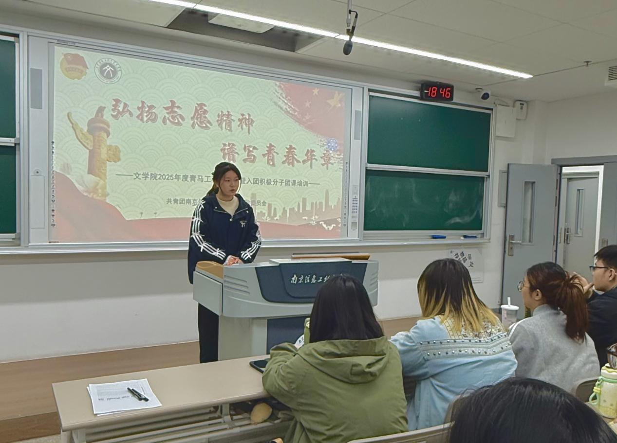 11月28日晚,文学院2025年度“青年马克思主义者培养工程”第六讲暨入团积极分子团课培训在明德楼N508顺利举行。本次活动由院分团委副书记丁羽桐主持,学院全体青马工程学员及2025年秋季入团积极分子共同参与。活动特邀三位优秀青年志愿者代表作主题分享,通过鲜活实践案例诠释新时代志愿服务精神,激励青年学子坚定理想信念、勇担时代使命。