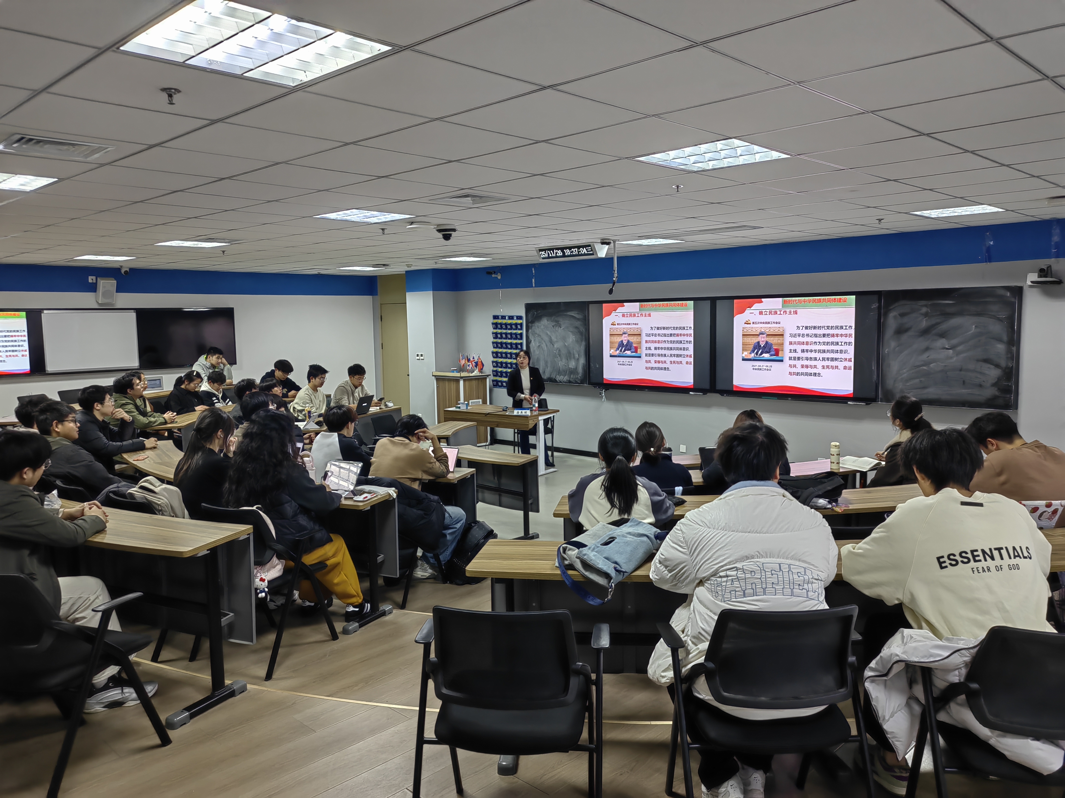 报告中,唐美丽以深厚的理论功底从中华民族共同体意识的形成逻辑、历史渊源与时代意义等方面进行了系统阐释,引导青年学生有效增进对铸牢中华民族共同体意识的整体性认识。唐美丽还结合南京六合竹镇镇的独特教育资源,向同学们介绍其作为“江苏省唯一享受民族乡待遇的乡镇”,在“政治上更加团结统一、经济上更加共富共享、文化上更加创新交融、社会上更加互嵌共融、生态环境更加和谐共生”等情况,为同学们生动展示了新时代中华民族共同体建设的新成就。