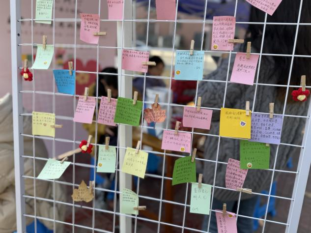 活动开始后,参与同学在工作人员的引导下有序签到并了解流程。现场设有感恩墙涂色区、便利贴书写区与小红花领取区。在感恩墙区域,同学们通过选择代表不同感恩维度的色块进行涂色,将那些平日被忽略的温情瞬间具象呈现。随后,大家在便利贴上写下想感恩的人、事或内心感悟,并将其悬挂于公共分享架上进行交流分享。最后,参与者登记领取象征感谢与鼓励的“小红花”,可选择自行珍藏或赠予所想感谢之人。活动全程秩序井然,工作人员热心引导,并捕捉下精彩瞬间。