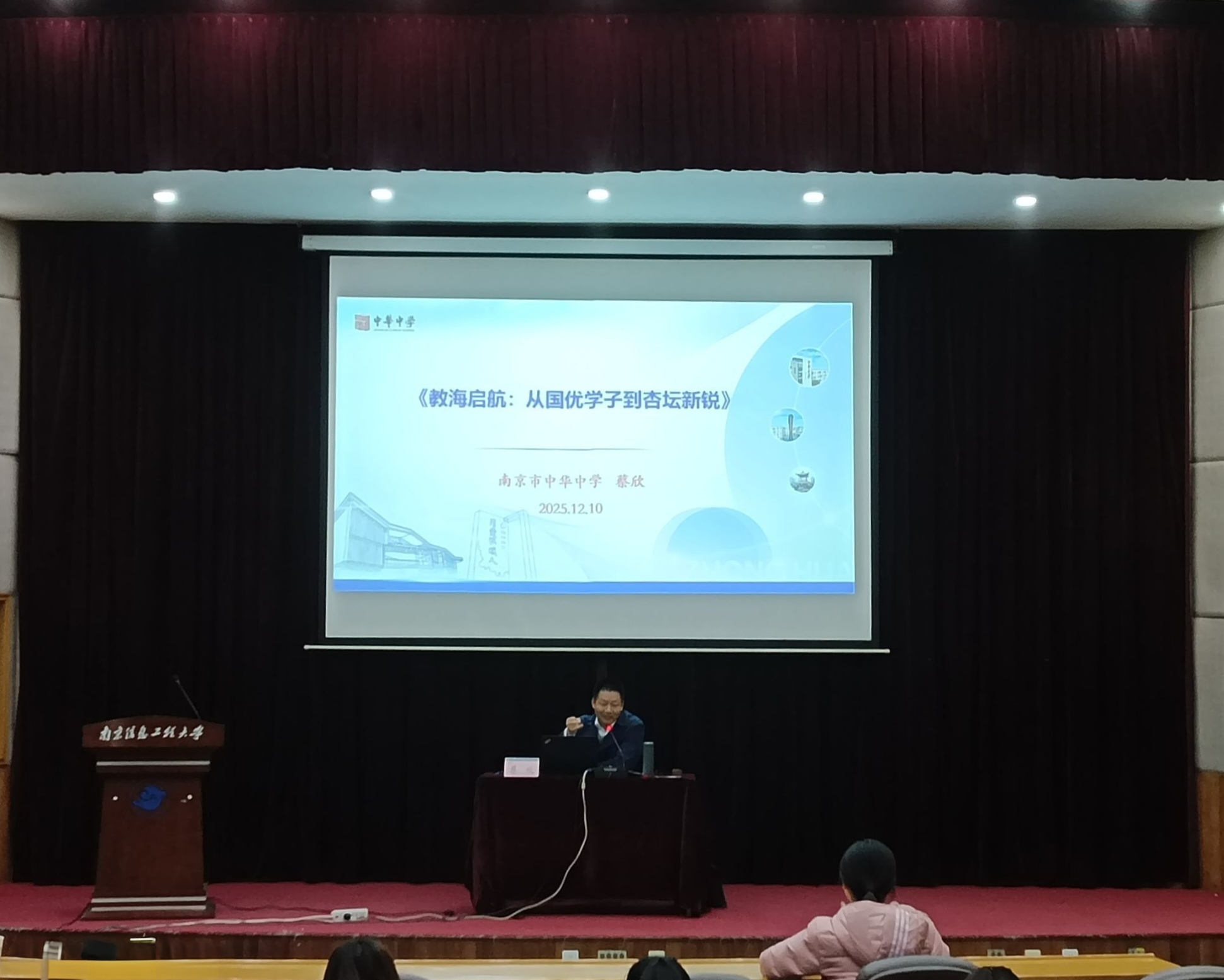 为进一步加强师范生对于教师职业的理解,12月10日,教师教育学院在长望楼N102报告厅举办敬学讲堂系列讲座。本次讲座特邀南京市中华中学副校长蔡欣主讲,作“教海启航:从国优学子到杏坛新锐”专题分享。学院2025级数学与应用数学(师范)本科生、学科教学(数学)研究生和国优计划研究生参加讲座,讲座由学院院长杨作东、专任教师崔志翔主持。
