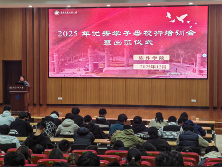 12月8日晚,软件学院在滨江楼报告厅举行2026年“优秀学子母校行”专题培训会暨出征仪式。2025级全体本科生齐聚一堂,共同开启这场“带着南信大故事回家”的青春实践之旅。活动邀请到学院辅导员姚小芹老师进行政策解读,陈可欣、胡永平两位往届优秀学子代表分享实战经验,助力同学们以专业姿态重返高中母校,讲好南信大故事、传递软院学子的青春风采。
