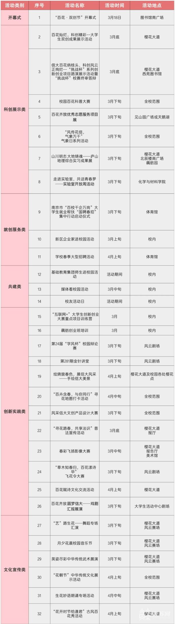 记者今天(3月16日)从南京信息工程大学了解到,南信大首届“百花·双创节”将拉开帷幕,绚丽的大学校园面向社会持续开放一个月,届时,会有丰富的创新创业、文化艺术等活动。