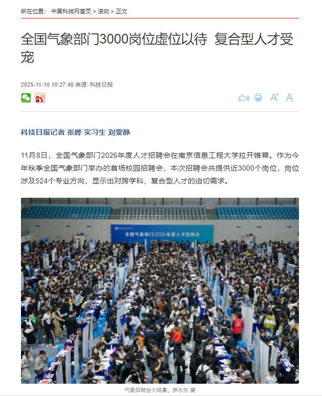 11月8日,全国气象部门2026年度人才招聘会在南京信息工程大学拉开帷幕。作为今年秋季全国气象部门举办的首场校园招聘会,本次招聘会共提供近3000个岗位,岗位涉及524个专业方向,显示出对跨学科、复合型人才的迫切需求。