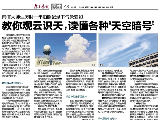 交汇点新闻“天上钩钩云,地上雨淋淋”到底是不是真的?“朝霞不出门,晚霞行千里”可以作为出行依据么?近日,南京信息工程大学师生共同推出“天空暗号破译指南”,教你观云识天,一起读懂生活中的“气象教材”。记者了解到,为了拍好这组照片,南信大师生在学校各处“蹲点”了整整一年。“拍摄天空的过程也是我们逐步了解大气科学,感受气象魅力的学习过程。”南信大融媒体中心学生记者汤家琪是“天空暗号”系列照片的摄影者之一,汤家...