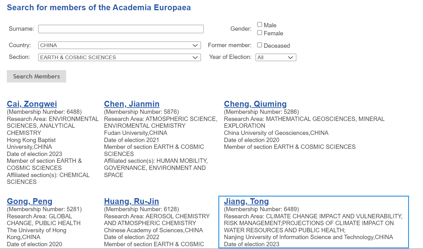 近日,欧洲人文和自然科学院(Academia Europaea,简称“欧洲科学院”)官网公布2023年新当选院士名单。我校气候与环境治理研究院执行院长、未来地球计划灾害风险管理研究院院长姜彤教授当选地球与宇宙科学学部外籍院士。