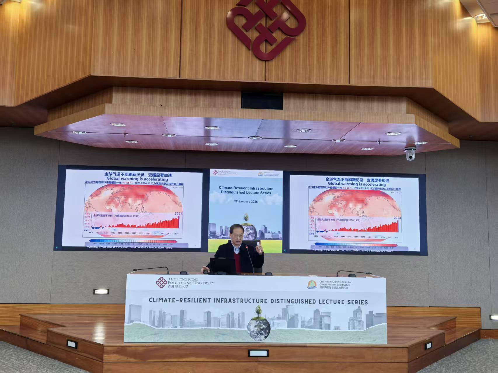 随后,代表团访问了潘乐陶韧性基础设施研究院。该研究院以提升关键基础设施在气候变化下的适应性与持久性为核心使命,在全球享有盛誉。王会军院士受邀作为主讲嘉宾,作了题为“全球变暖加速与气候极端化:新特征与挑战”的特邀报告,这也是“气候韧性基础设施杰出学者讲座系列”的首场报告。王院士的报告深入剖析了全球变暖加速的科学证据及其对极端热浪、暴雨、干旱等事件的影响机制,引发了香港理工大学师生的浓厚兴趣。在研讨环节,双方就未来气候变化的特征及成因、气候变化对工程设计与城市规划的影响等进行了热烈而深入的讨论。