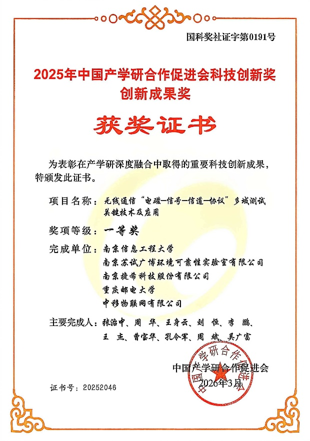 近日,第十七届中国产学研合作创新大会在北京召开。学校张治中教授团队主持完成的“无线通信‘电磁-信号-信道-协议’多域测试关键技术及应用”项目,凭借在核心技术上的重大突破与显著的产业应用价值,从全国众多参评成果中脱颖而出,荣获2025年度“中国产学研合作创新成果奖一等奖”。