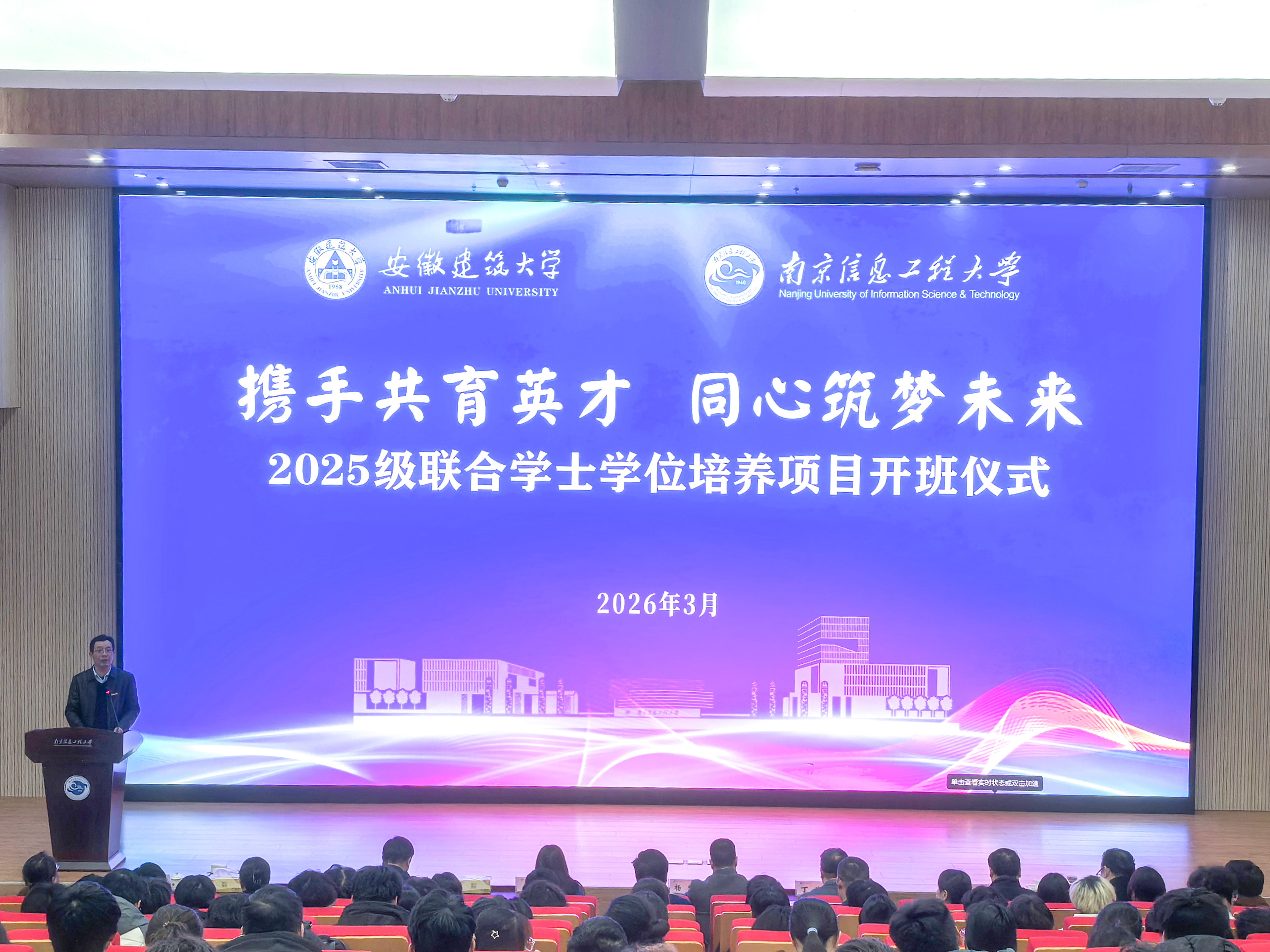 3月18日下午,安徽建筑大学-南京信息工程大学2025级联合学士学位培养项目开班仪式在金牛湖产教融合园区举行。安徽建筑大学党委常委、副校长杨科,南京信息工程大学党委常委、副校长马嫣出席仪式并致辞。仪式由金牛湖产教融合园区党委副书记、管委会副主任章胜主持。