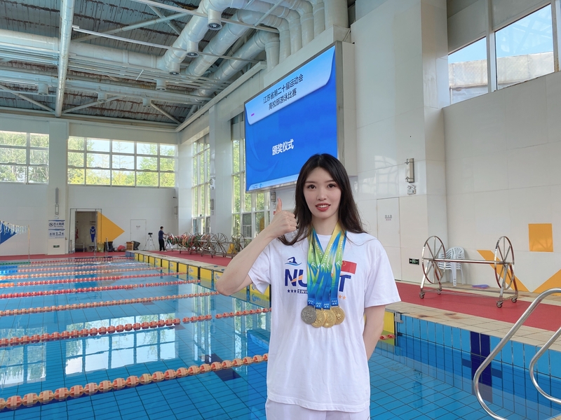 在9日上午的比赛中,我校戴畅宇同学夺得甲B男子组1500米自由泳冠军,这也是本次比赛诞生的首枚金牌。1500米自由泳是典型的“铁人”项目,二十多分钟的耗时对体力、耐力和心态的考验是极大的。戴畅宇在开场就稳定了自己的绝对优势,并全程都保持着稳定的游速,最终夺得第一名。作为南信大游泳队里的“大姐大”和精神支柱,应用技术学院18级的苏筱辰同学在她的主项蝶泳上包揽甲B女子组50米、100米、200米蝶泳所有冠军,并带领女子接力队获得混合泳接力金牌和自由泳接力银牌的优异成绩。10日下午,在甲A男子组50米仰泳决赛中,来自苏州大学的侯雨辰同学以26秒的成绩打破了江苏省大学生在此项目的最佳记录。