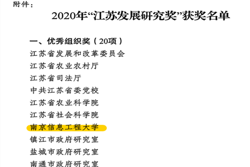 近日,江苏省人民政府研究室公布了2020年“江苏发展研究奖”获奖名单,我校有三项决策咨询类成果获奖。其中,闵锦忠教授撰写的成果《关于构建长三角一体化气象保障平台和机制的对策研究》、蔡银寅老师撰写的成果《关于实施大气环境资源监测和构建大气环境资源管理体系的建议》获优秀成果二等奖,曹信邦教授撰写的成果《关于增加建立重大疫情应急储备基金的立法建议》获优秀成果三等奖。同时,我校获2020年“江苏发展研究奖”优秀组织奖。