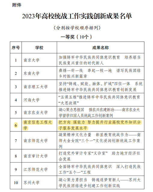 为交流推广近年来高校统战工作的典型经验做法和实践创新成果,促进全省高校统战工作提质增效,江苏省委教育工委在全省高校组织开展统战工作实践创新成果征集活动,我校报送的《把方向 强能力 努力提升行业高校党外知识分子服务发展水平》荣获一等奖。