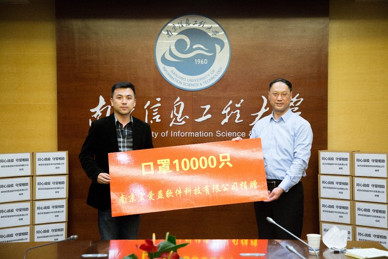 4月16日,爱心企业南京宏爱益软件科技有限公司向我校无偿捐赠一次性口罩10000只,捐赠仪式在行政楼428会议室举行。南京宏爱益软件科技有限公司董事长吕杰、总经理刘志华,我校校党委副书记、副校长王尧以及党校办、团委等相关部门人员出席。