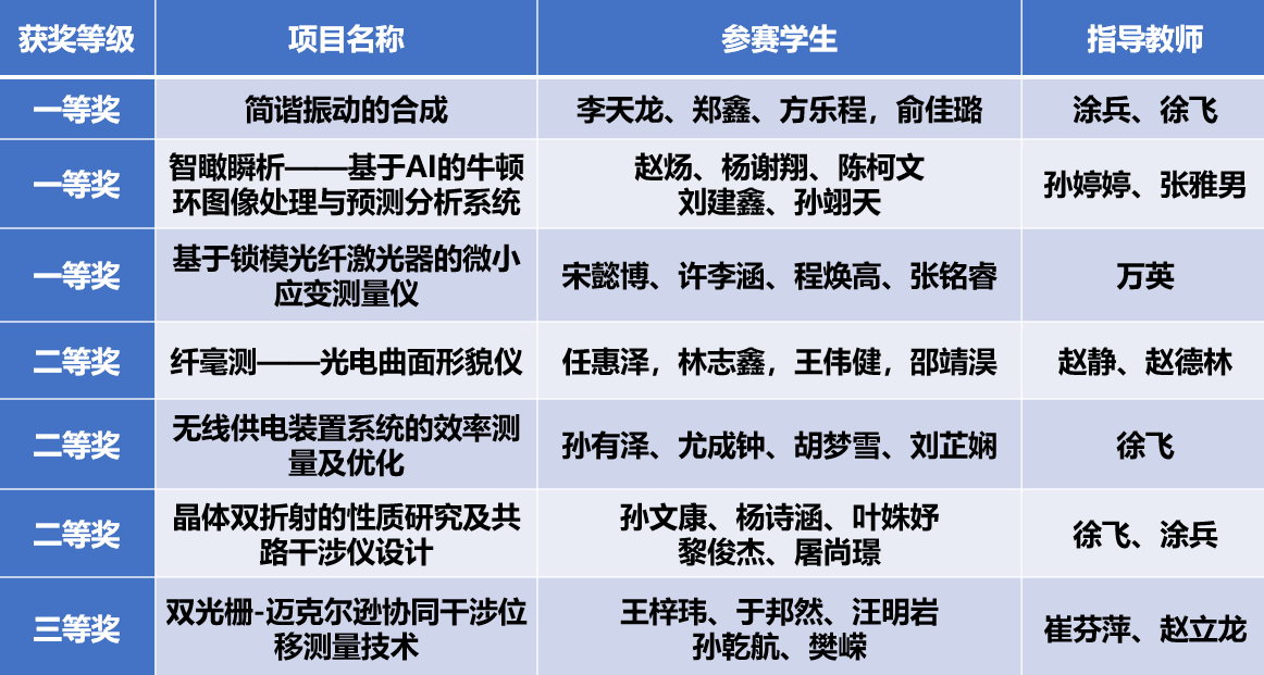 由我校物理与光电工程学院教师负责组织与指导,来自物电院、雷丁学院、教师学院、电信院、应气院、计算机学院、长望学院、自动化学院的31名同学组建的七支代表队经过初赛选拔,获得参加决赛的资格。其中由涂兵、徐飞老师共同指导的《简谐振动的合成》和孙婷婷、张雅男老师共同指导的《智瞰瞬析一基于AI的牛顿环图像处理与预测分析系统》在命题类作品中获得一等奖;万英老师指导的《基于锁模光纤激光器的微小应变测量仪》在自选类作品中获得一等奖。